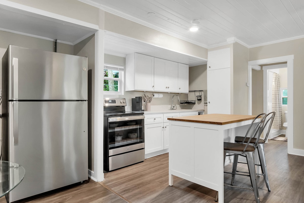 Newly remodeled kitchen includes everything you need to prep meals on site - an induction 4 burner cook top, microwave, toaster oven/air fryer and full sized fridge. Included is a Keurig for morning coffees outside on the covered patio or in the privacy of your outdoor private garden. If you prefer an individual French press coffee or loose leaf tea with infuser is also available.