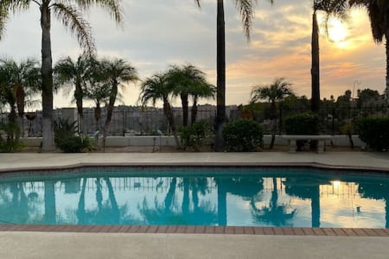 Guest Suite in home enter through front door. Double room overlooking pool and back patio. Designated parking in front driveway. Super comfy Queen size bed, 42 inch TV, mini-fridge, Kuerig coffee or home made espresso by Bob. Table in suite for meals or working. Private bathroom with full size bathtub is directly across hall. House on very safe and private cul-de-sac sits on nice, quiet fully fenced 1/2 acre. Two cats in the yard. Overlooking mountains of Camp Pendleton with awesome sunsets!! Quick 1 mile walk to town for the World Famous Avocado Festival. Hosts don't smoke but will allow outside smoking and 420.