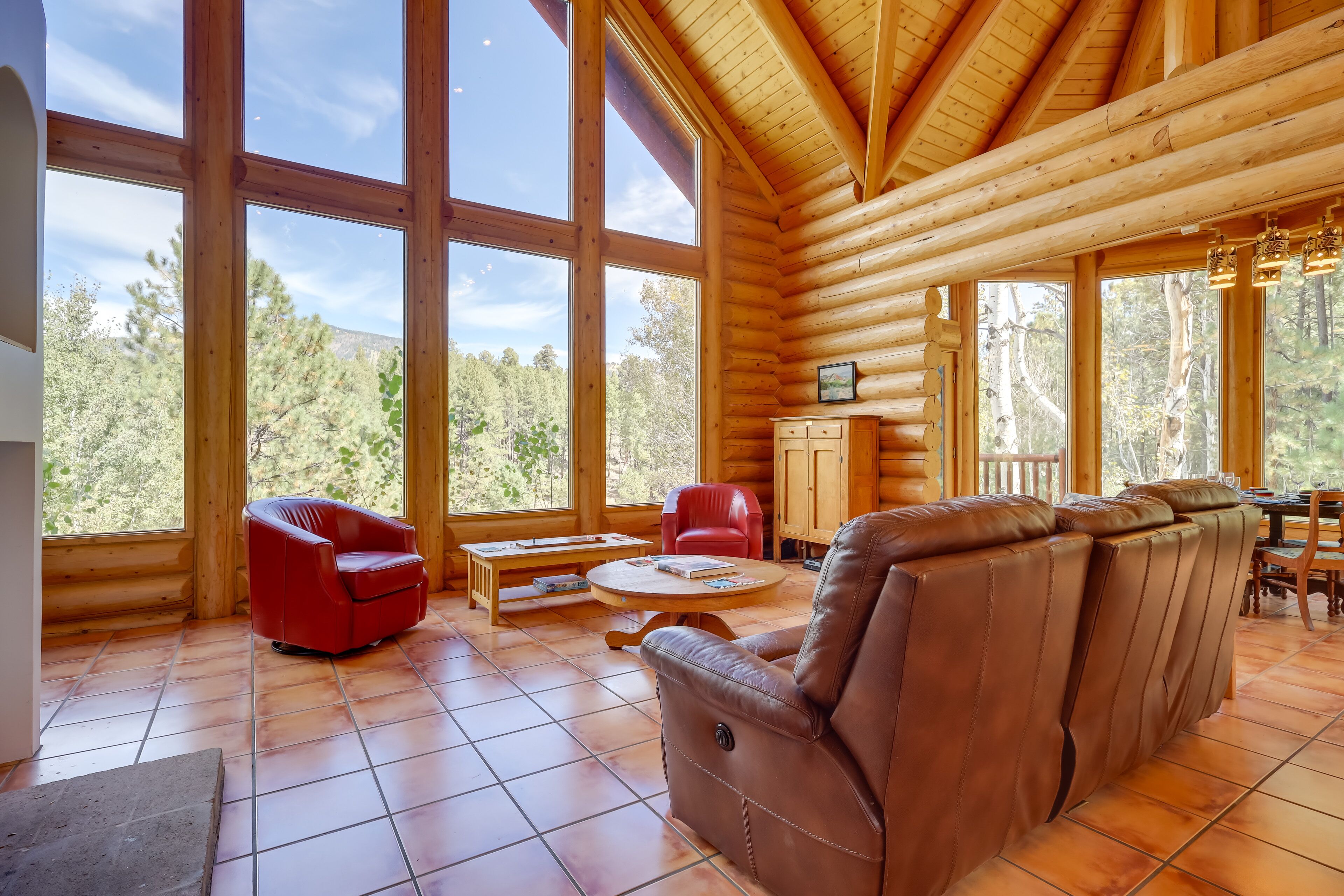 CABIN FEATURES: Great room w/ floor-to-ceiling windows, dining tables, lounge seating, reclining sofa, books, board games, log cabin furnishings, southwestern decor, large loft with game table and sofa