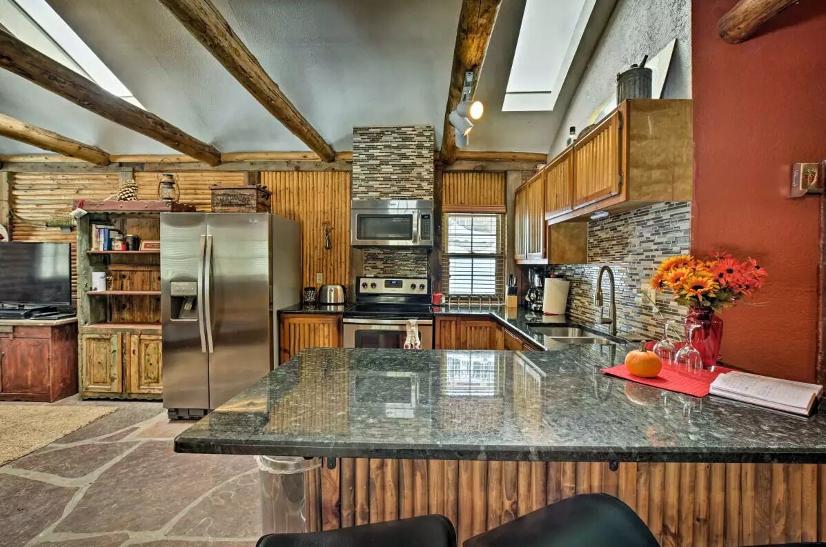A large open kitchen, dinning & living space with vaulted ceilings and pendent lighting is situated in the middle of the home. Windows throughout the room provide natural lighting and beautiful sights at every angle. There are two counter height bar stools and 4 rolling chairs w/bench seating at the dining area, seating 8 comfortably for meals. Massive custom designed granite countertops provide plenty of space for the ideal family gathering. There is a kiva in the room to warm yourself during the winter. Updated living room furniture & a massive Firestick TV (with Pluto TV) is fixed to the wall. New Oven (23'), current hot tub is new as of April 23 (24 hours to warm).