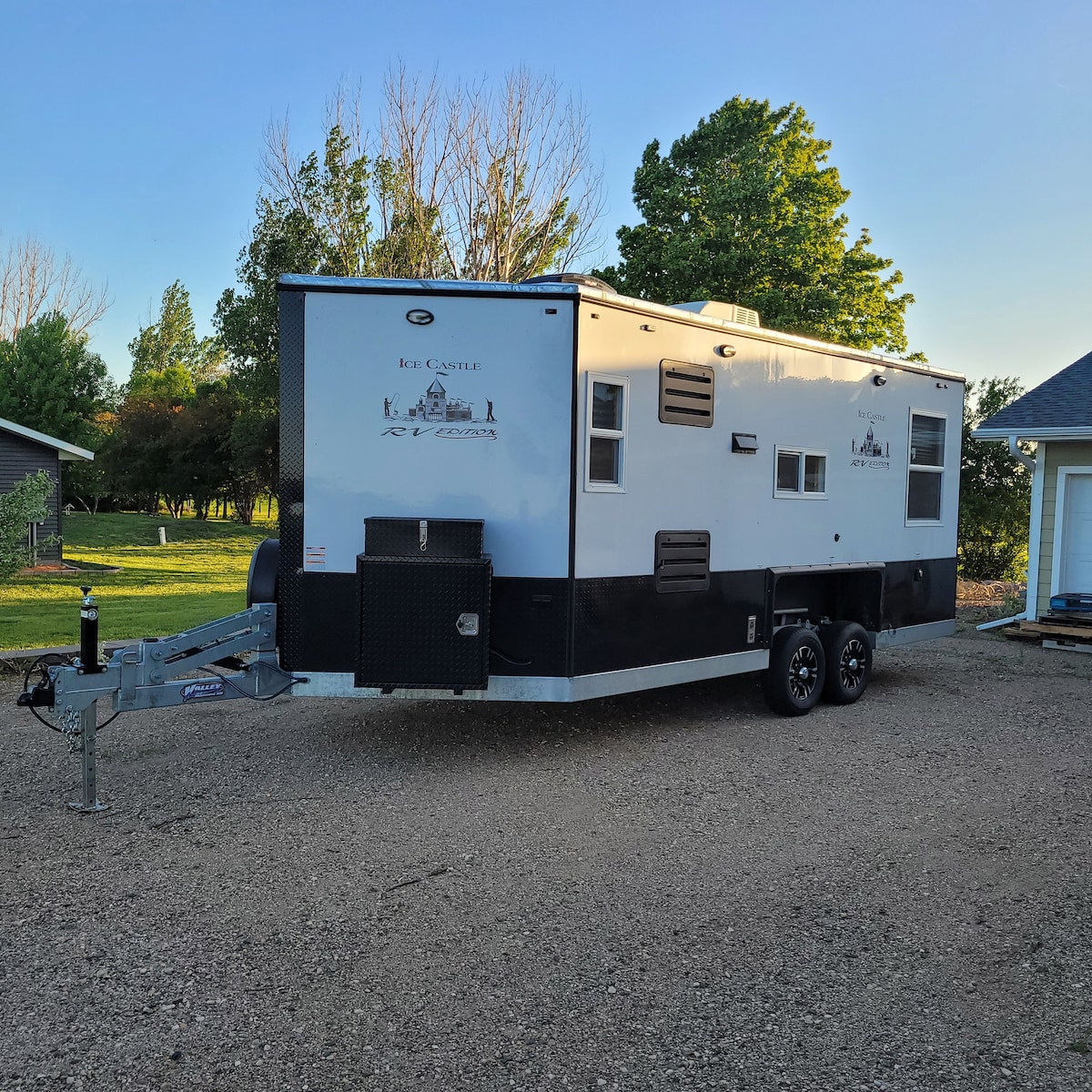 New Ice castle for rent. Have a spot where you want it? I will deliver it to you and set it up within 25 miles of Fergus Falls. New 2024 tandem hydraulic house. Has running water for a sink, fireplace, 2 tvs, dvd player, exterior speakers, lift bed in rear, bunks in the "V". storage closet. Can sleep 4-5. A/C