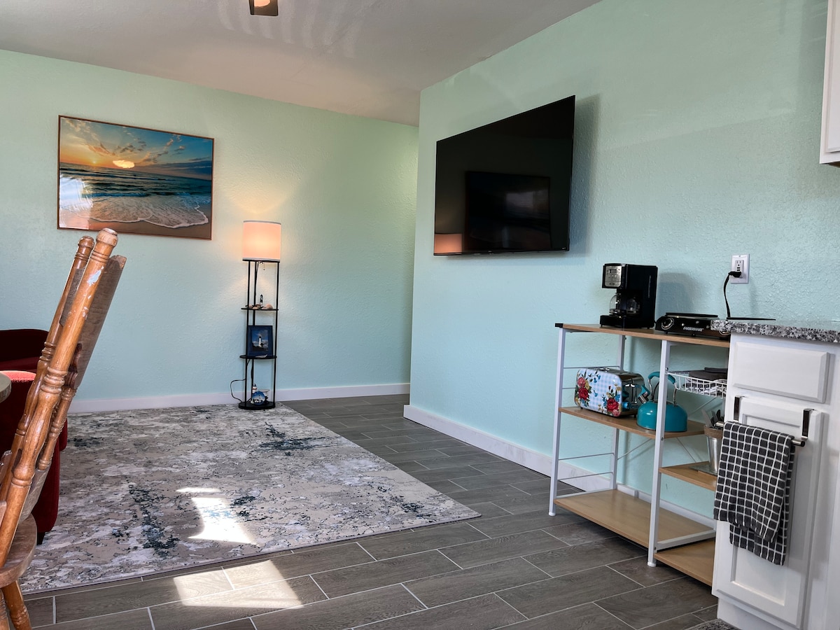 Enter your SEASIDE GUEST SUITE through your own private entrance with keypad door lock. Your suite will be on the second floor of our beach house. Upon entry, you'll notice everything you need for a great vacation at the beach! Our furniture, linens, and decor are reminiscent of ocean waves, clear skies, sandy beaches, and sea salt air! Your luxury beach towels and toys are nestled in a basket, waiting for you to grab and go! A kitchenette is equipped with dishes, glasses, silverware, and many appliances for preparing food and drinks. The main living area contains a daybed with two twin beds, a cabinet filled with games and books, a dresser, and a TV with popular apps. The King Bedroom is private with lots of storage spaces and a rocker glider with ottoman.