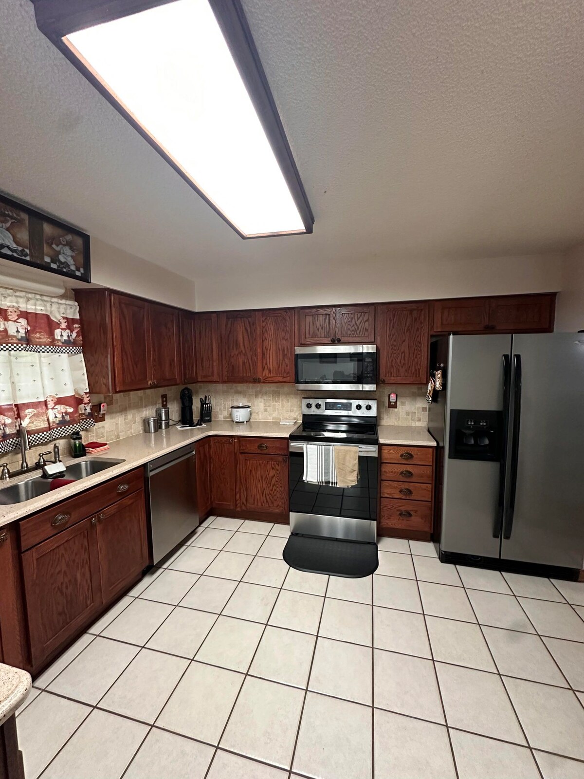 KITCHEN: Electric stove/oven, refrigerator, microwave, Keurig coffee maker w/ K-cups, dishware & flatware, cooking basics
