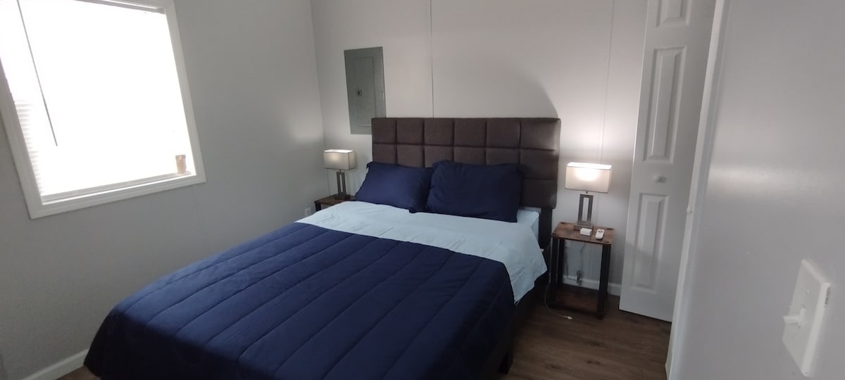 This stylish bedroom comes with a king sized bed with a comfy mattress and linens. It has a large closet and storage space for extended stays. Black-out curtains, great for sleeping in.