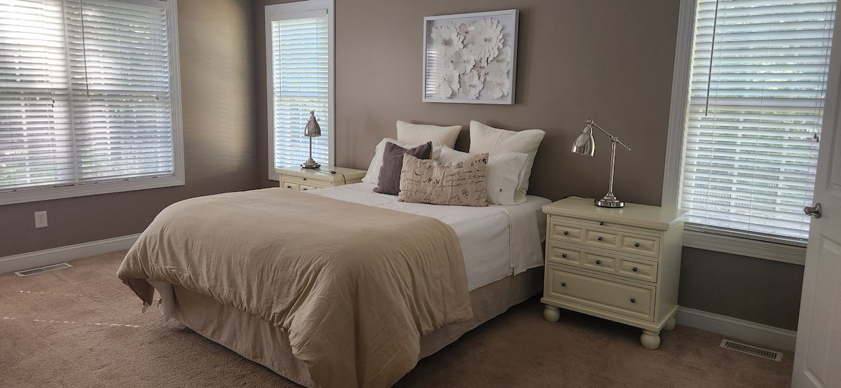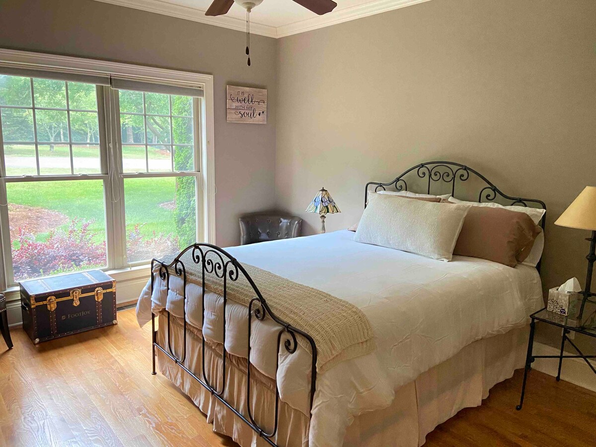 Discover our stunning King Suite in Fort Mill, SC, where natural beauty surrounds you. Experience a peaceful oasis with picturesque views of lush forests, greenery, and vibrant leaves. Conveniently located in a central area, our Airbnb provides easy access to local attractions and amenities. Our suite offers regal comforts, including a spacious shower with beautiful tiles, a jet tub to rejuvenate and an outdoor space to relax and enjoy the nature forest. Book today for an extraordinary getaway.