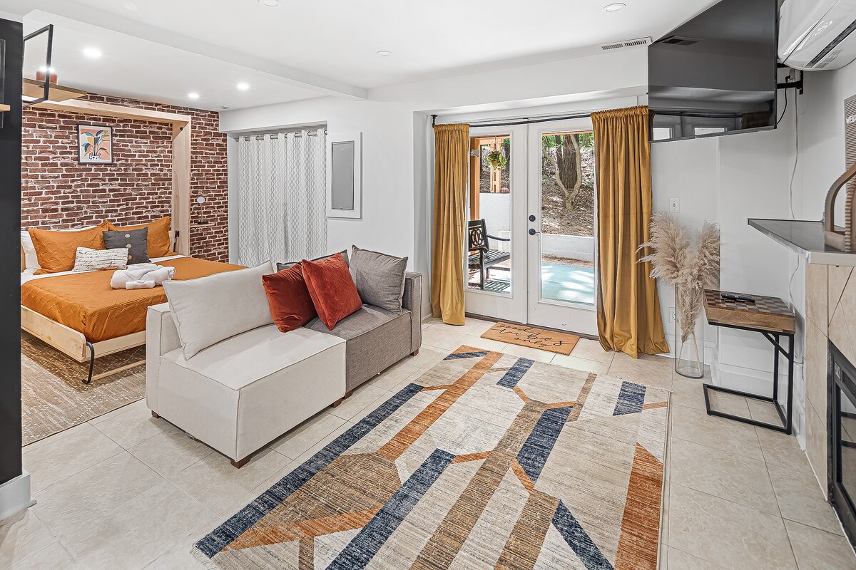 Enjoy a comfy Queen Bed, a living room with day bed, TV and small fridge.
