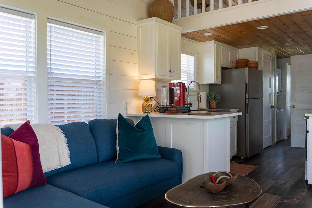 This boutique-style retreat offers approximately 200 sq ft of well-designed space — ideal for a peaceful Hill Country escape. Inside, you’ll find a cozy sleeping area with luxe linens, a compact dining nook, and a fully equipped kitchen featuring a refrigerator, stovetop, microwave, cookware, dishes, utensils, and Keurig coffee/tea makers.