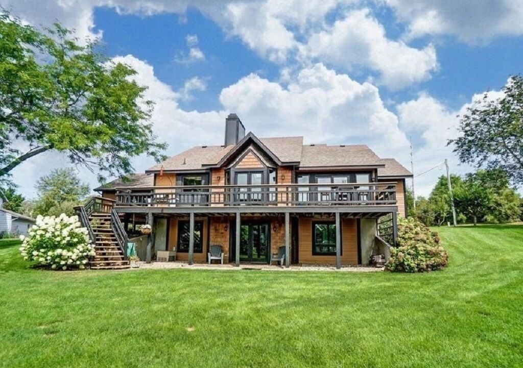 This lakefront vacation home sits on a half-acre of land in an uncrowded portion of Clear Lake with a panoramic view of the lake as well as views of farmland behind the house. There are large flat grassy areas for play activities. There is a private dock and 70 feet of lake frontage.