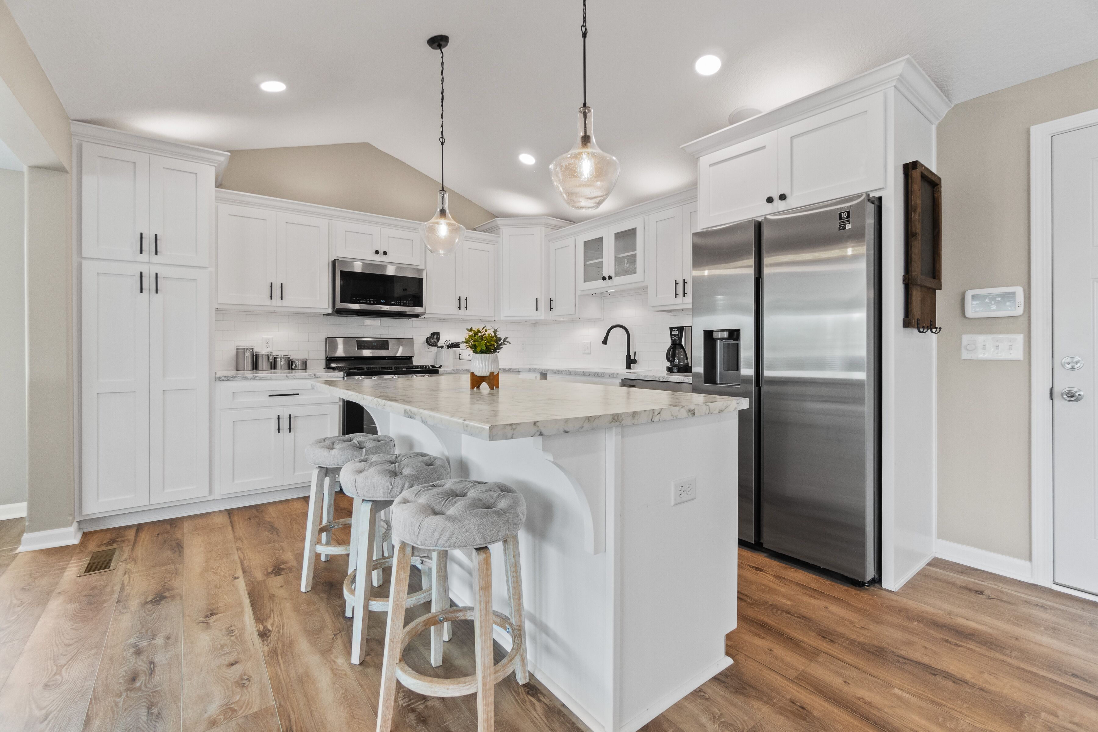 The modern kitchen features beautiful quartz countertops and new cabinetry, fully stocked with nearly everything you'll need for preparing meals. The dining area seats 6 (4 chairs provided), with additional seating for 3 at the kitchen peninsula.