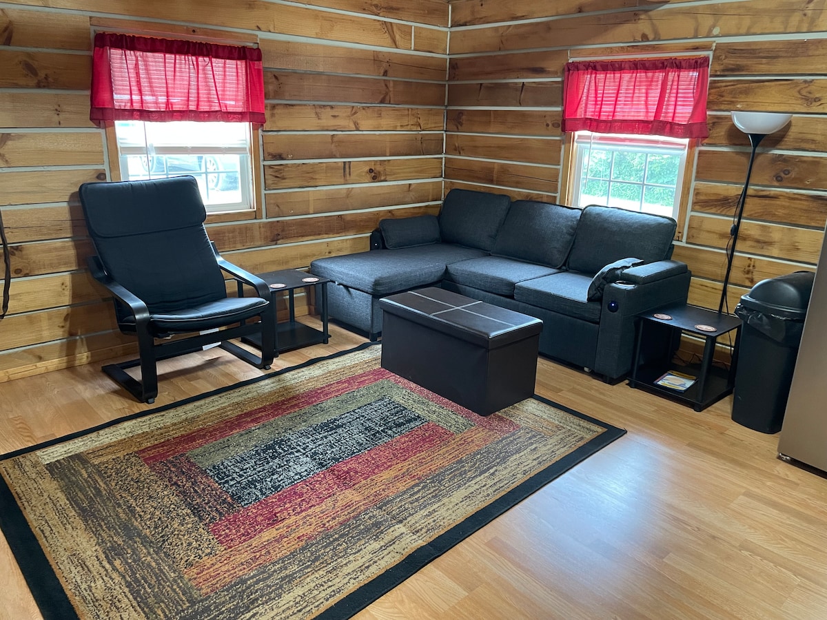 Our 2 bedroom with loft cabin has all the comforts of home and can sleep up to 6. The loft bedroom with queen bed opens to the living room below. Another bedroom on the main level provides a full bed and additional sleeping space can be accommodated with the queen sized futon in the livingroom.