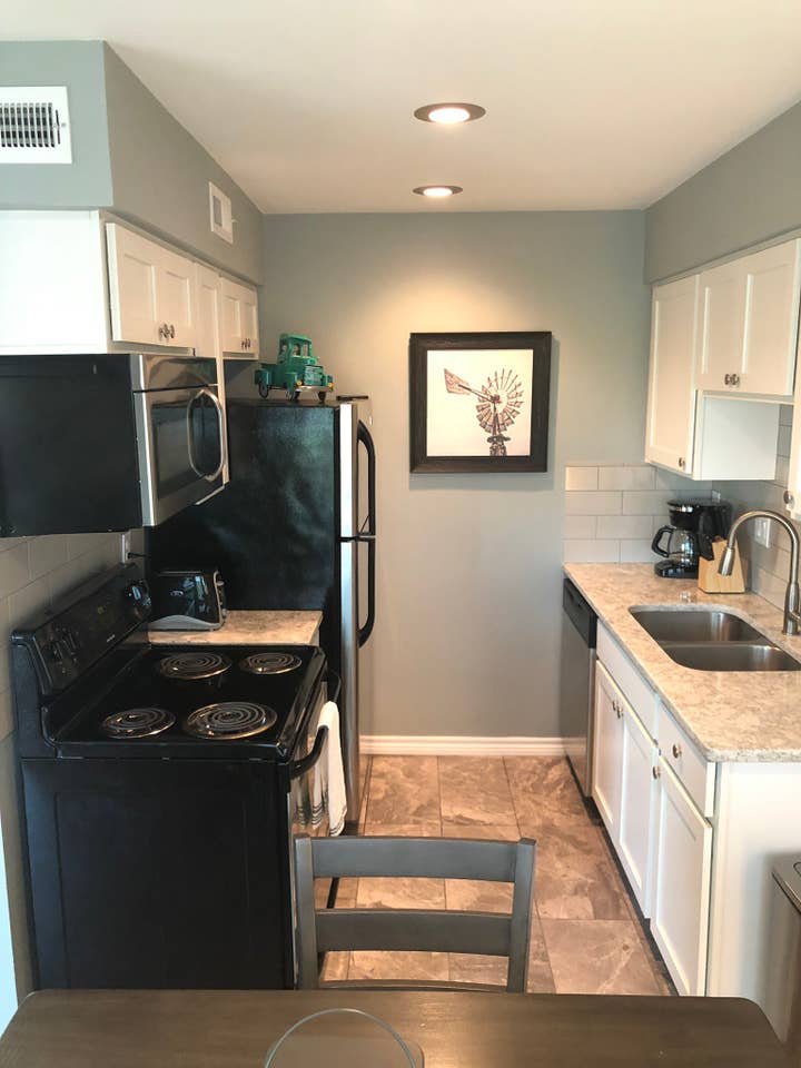 The living room welcomes you with colorful and stylish decor throughout. The couch is situated in front of a flat screen TV. The upstairs deck is charmingly decorated with a BBQ grill and seating, great for the warmer days! Both kitchens come equipped with a drip coffee maker, toaster, blender, microwave, and much more to make you feel right at home!