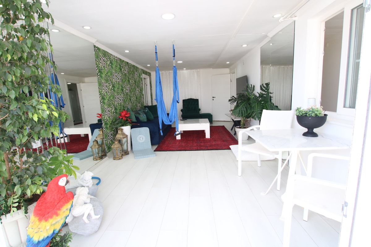 Newly designed avalaibla for short term rent concept private big roof with Barbecu , jacuzzi, TV and sport salon with Side terrace iş 10 min. to Izmir Airport. 3 min to Izmir fair and 200 m walking distance to the important metro stations where you can go even anywhere .Ephesus , Kuşadası Çeşme iş 50 min away our location is a great chance of you have car. Very close to Optimum Mall biggest shopping center for dün times This private , peacefull house has unique touches ..