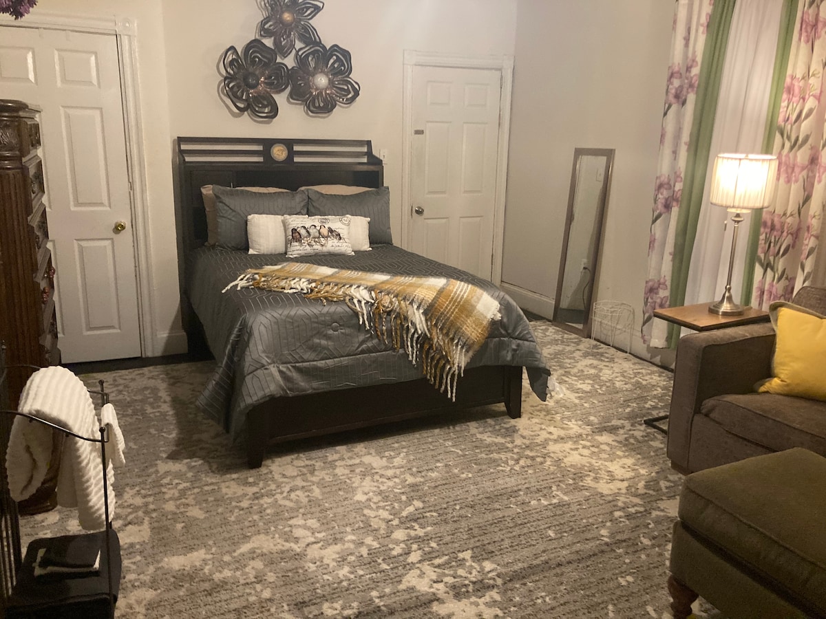 Located on the 2nd floor, this room has 2 large windows, closet, desk and a comfortable king size bed. The full-size bathroom is located just outside the room. This beautiful, very spacious room has WIFI, A/C and Cable TV. Private parking is also available.