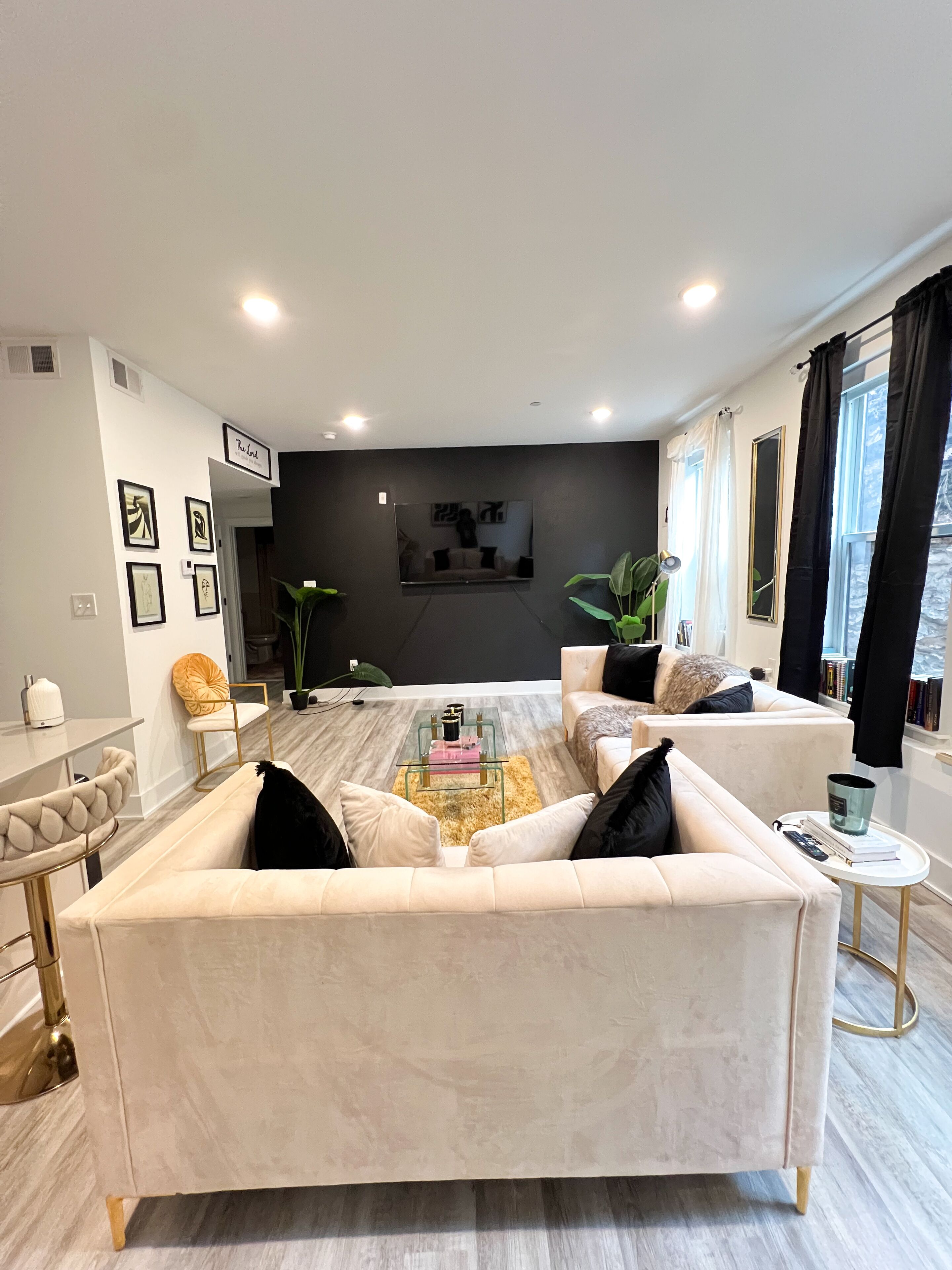 Welcome to our beautifully renovated apartment that has been meticulously designed with your comfort in mind. Located on the third floor of a grand old Philadelphia home, this modern yet traditional 2 private bedroom apartment will make you feel at home the moment you step through the door. As you enter, you will be greeted by a cozy living room with a comfortable couch where you can relax and unwind after a long day exploring the city. Catch up on your favorite shows on the mounted flat-screen TV or have a movie night with friends and family. The living room opens up to a fully equipped kitchen that has been thoughtfully designed to make meal times comfortable. Enjoy your meals on the mounted countertop that provides ample space for eating and cooking. The kitchen comes equipped with a stove, oven, microwave, coffee maker, toaster, and all the dishware, cookware, and flatware you could need. The bathroom has been beautifully designed with ceramic tiles and features a comfortable tub and shower for long soaks. It also comes with a toilet, vanity, and mirror to complete the space. Both bedrooms have a cozy queen bed, plenty of windows for natural sunlight, and ample closet space. Each bedroom also has a private doorway for added privacy. One bedroom is furnished with an old-style desk, perfect for working from home. Stay connected with our powerful and reliable wifi, available throughout the apartment. Step outside to a shared deck where you can enjoy the sun or work outside. With plenty of free street parking available, this apartment is ideal for short or mid-term stays for you, your family, friends, or work colleagues. Enjoy total privacy in this apartment, where each bedroom sits at opposite ends of the space. We look forward to welcoming you to our wonderful apartment in Philadelphia – your home away from home.
