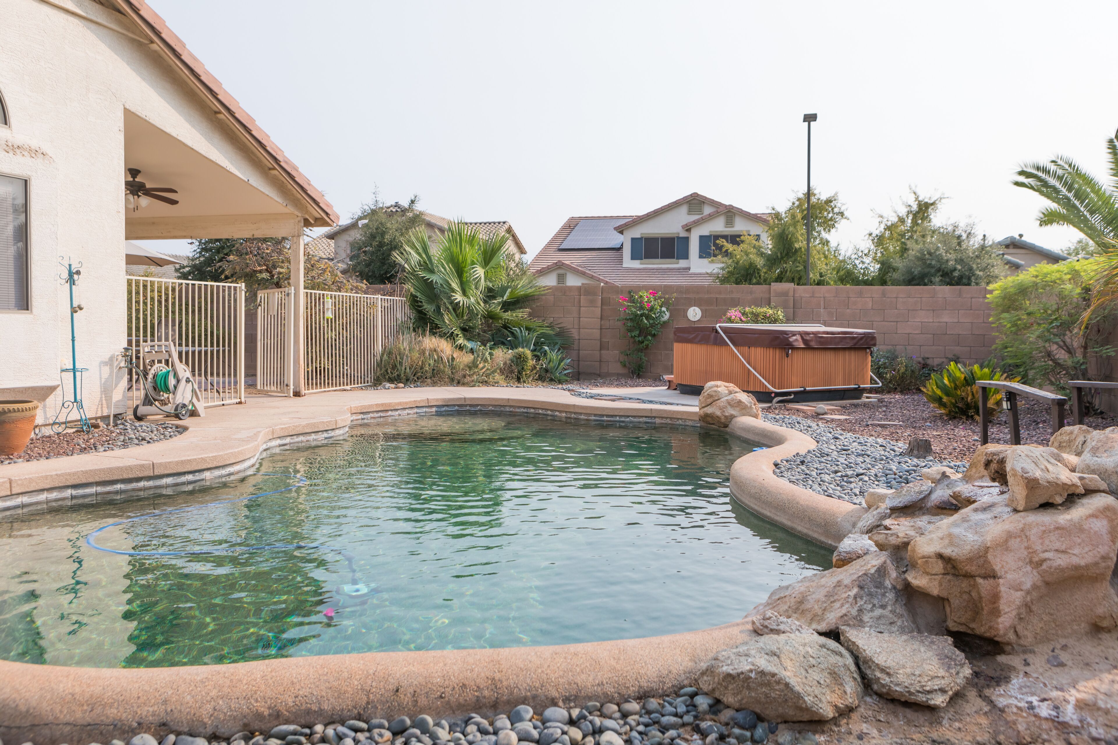 Our home is in the quiet, tranquil location of the 'Retreat' area of Estrella Mountain Ranch with wide-open 'green' spaces both in front of, as well as behind, the home on over a 1/2-acre lot. Our professionally landscaped private back yard features a heated pool and an in-ground spa with expansive desert and mountain views. The pool has a pebble tech finish, colored lighting at night, and a waterfall feature. Fire up the BBQ in the 'L' shaped island that features a fridge, searing, and side burners, and a large grill. An outdoor dining table is placed comfortably under a covered deck right outside the kitchen, as well as adjacent to the outdoor kitchen, accessible via a sliding patio door. Barstools around the outdoor kitchen provide additional seating spaces. Relax and enjoy!