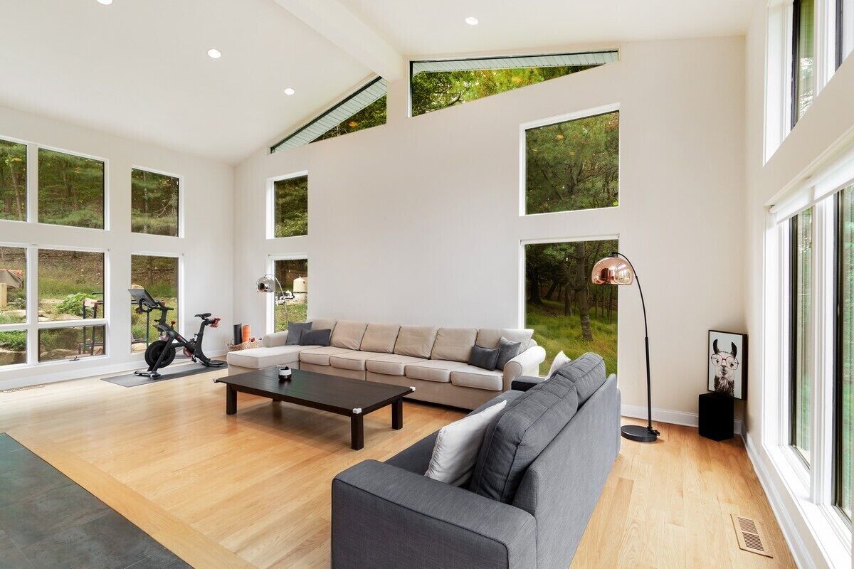 Living Room: Two large sofas, pastoral and tree views from every room, and French doors opening to a tree-lined front yard. Smart TV with YouTube TV for local channels.