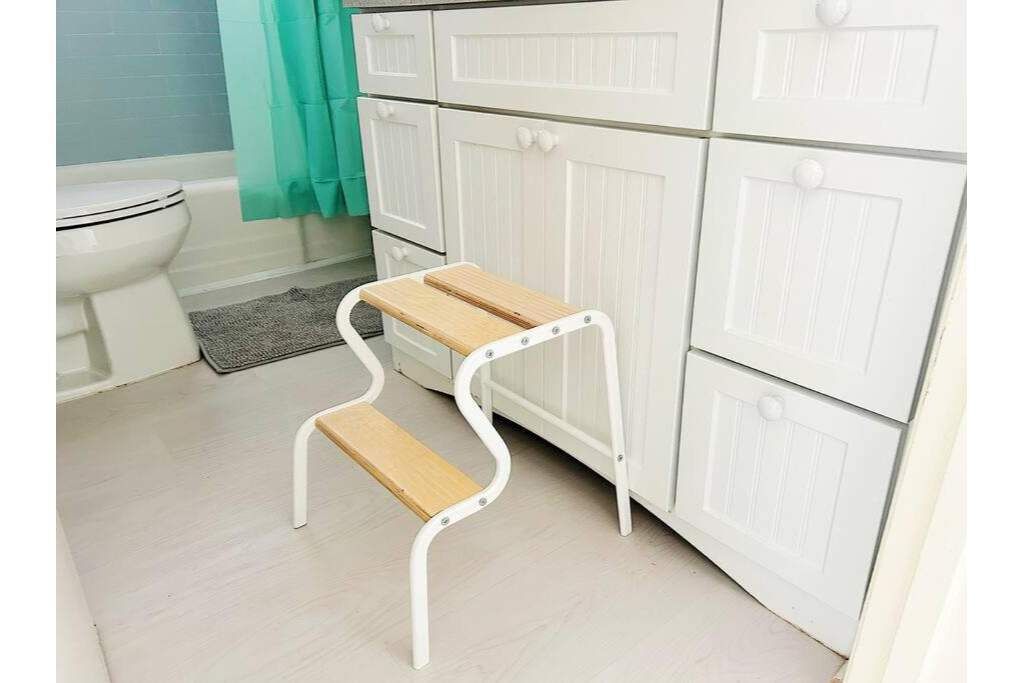Amenities include a brand new Galanz mini fridge, electric kettle and French press, fluffy pillows and comforters (with extras in the cabinets above), a Soma water filter carafe, silverware and basic kitchen tools, and fast WIFI. There is no stove/oven, the original oven is intact for its charm only!