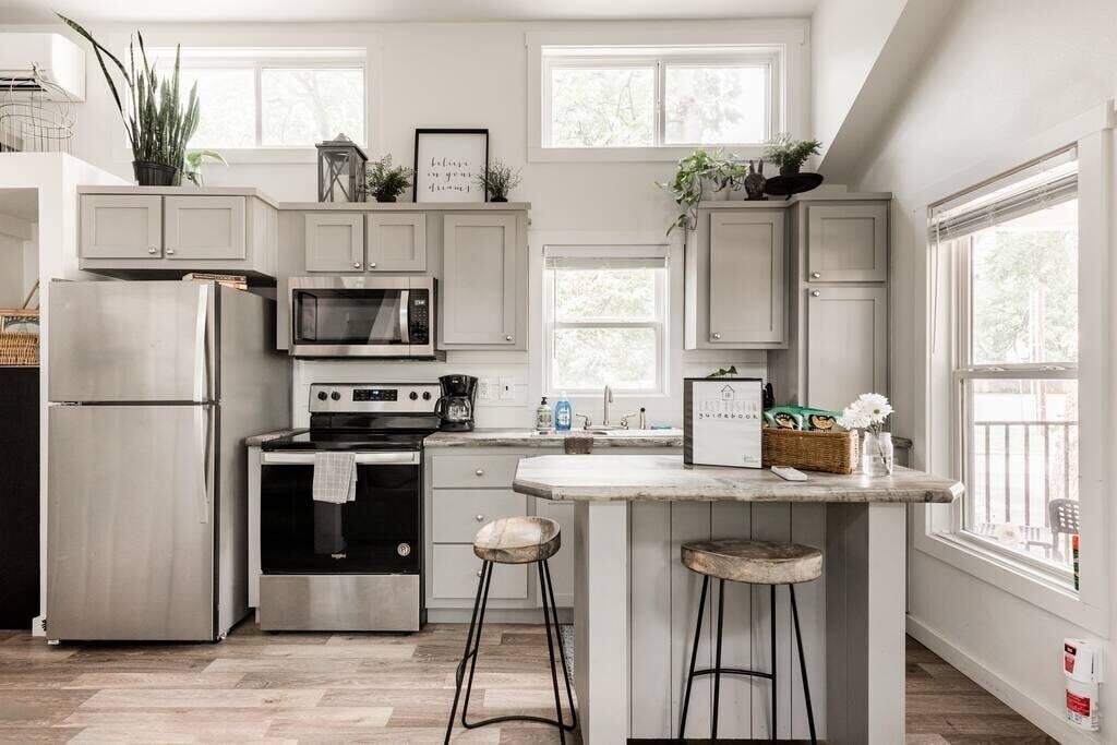 Tiny house features a medium size fridge & freezer, microwave, and basic utensils. Please note, this is not necessarily for a long-term guest who plans to cook !The TH is Ideal for those who are less interested in cooking and more interested in the abundant coffee shops and restaurants the East side has to offer and enjoy the night life!