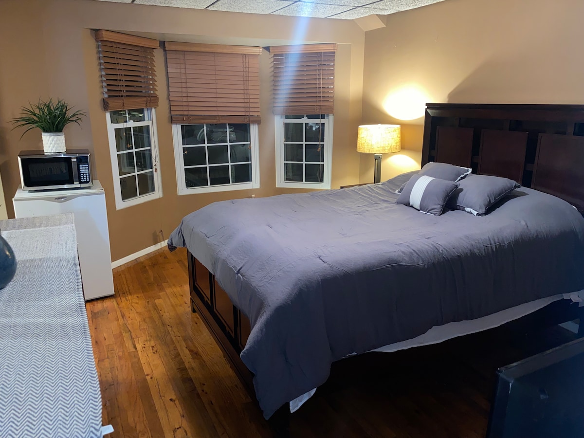 Polished hardwood floors, cozy decor, thick shades to block out light if needed. Big bay windows which capture plenty of natural light and illuminate the room. Closet space and dresser if needed for clothes. There is a full bathroom with a standing shower and a fridge with complimentary waters. A Keurig machine with complimentary coffee pods, and a microwave to warm up any food.