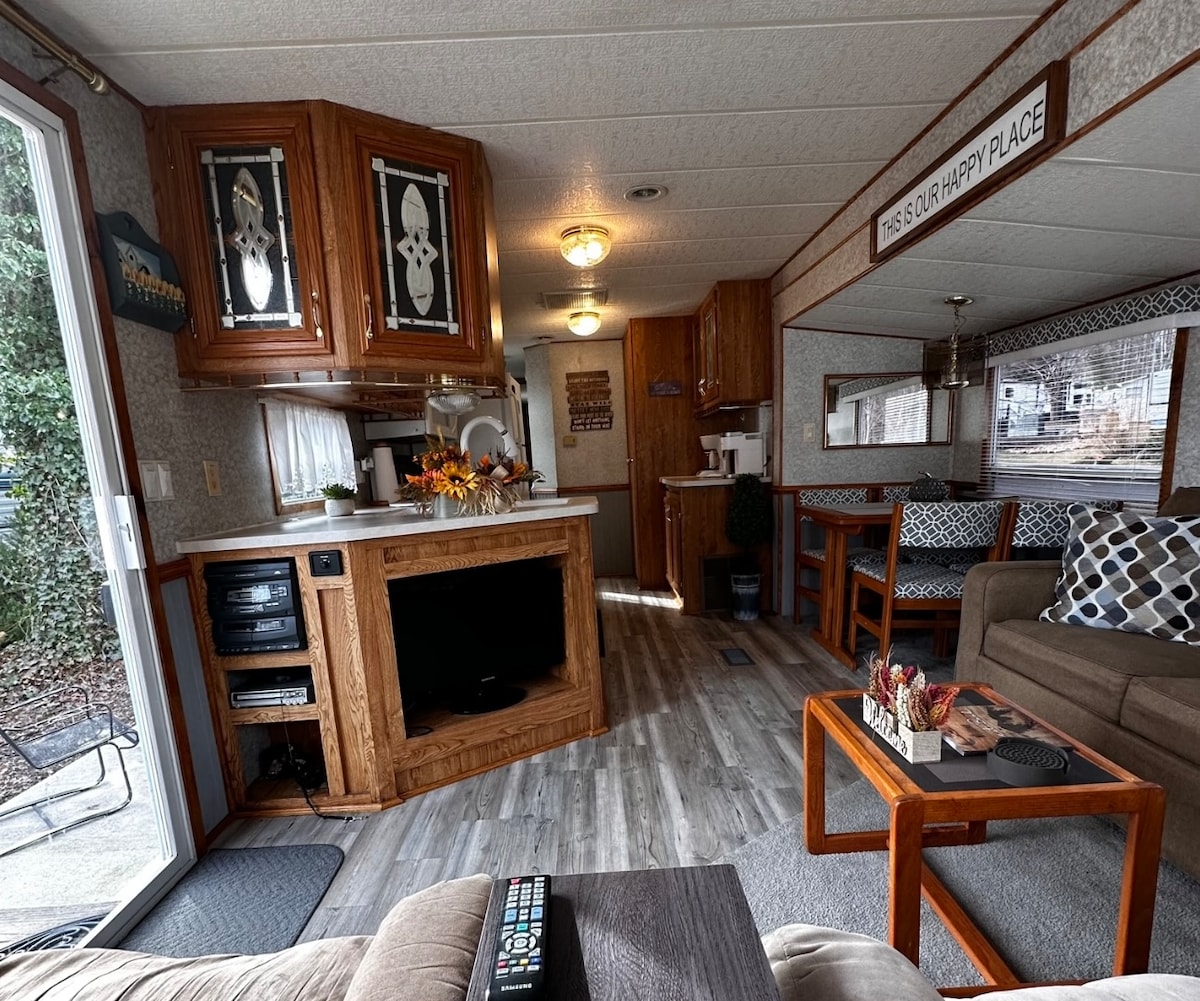We have a living room with two reclining chairs and a queen size sofa bed. 2 TV (one in the bedroom) cable and Wi-Fi throughout. The kitchen has everything you might need to cook a meal. We even provide a blender and crockpot (wine glasses). The bathroom has a regular commode, bathtub, shower ,sink, and a closet. The bedroom has a queen size comfy bed with large closet. chest of drawers and cabinet space for storage. TV with cable. Outside you have a patio with chairs, (+ 2 zero gravity ) barbecue grill and a gas grill . Large fire pit. Adirondack chairs around the fire pit. there is free parking for one vehicle. There is overflow parking for extra vehicles across the street.  We have a lighted entrance with no steps and aprox. 4 steps to enter the RV. The lights are to enhance the property and for your safety. CLEANLINESS and SAFETY are our priorities. We would love to have you as our guests!