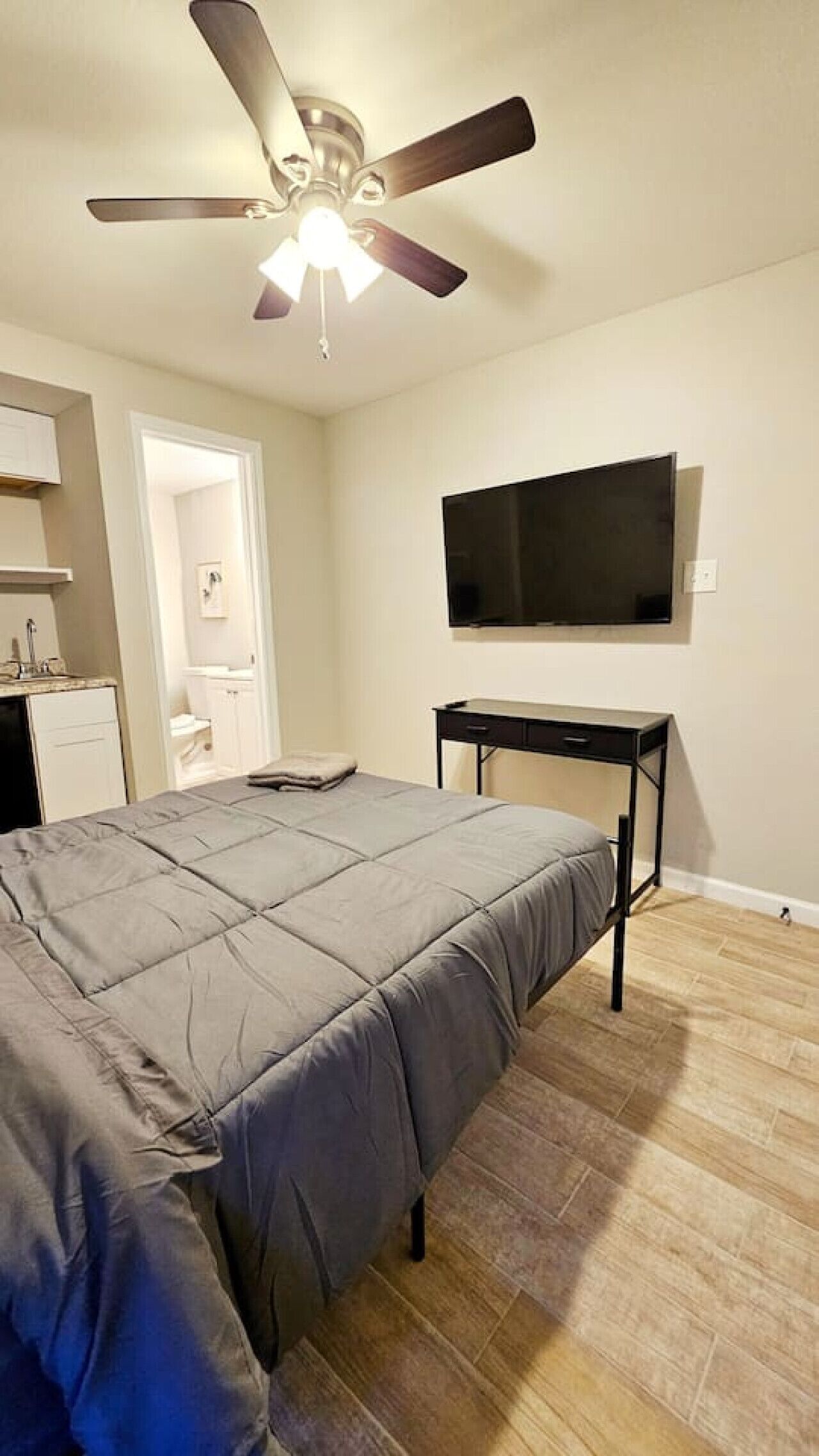 When you walk inside, turn on the ceiling fan and lights with the switch on the wall next to door. You will see a full-size bed equipped with two pillows and comforter. The wall-mounted AC unit can be set to your personal preference. You also have a nightstand drawer, desk, smart TV, fridge, a small counter with sink, microwave, walk-in closet space, and bathroom with a wall-in shower. Use blinds on windows for privacy and adjust lighting.