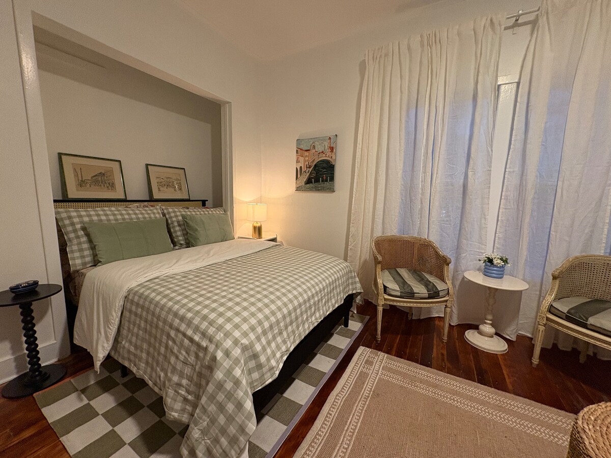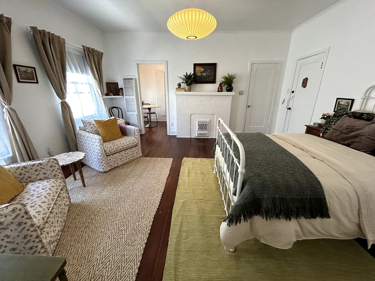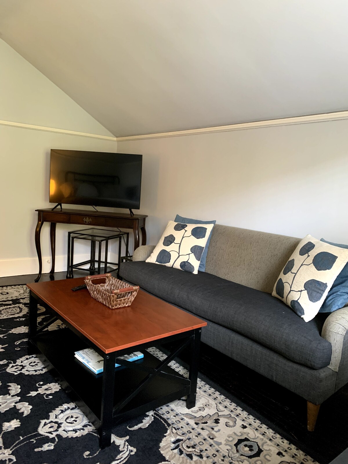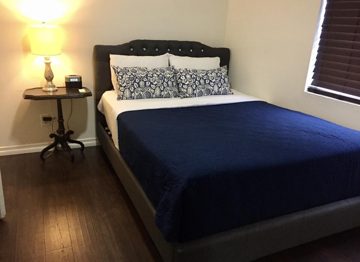 The guest room and bath can be accessed through a locked driveway gate to the backdoor of the house. The room features a king size bed, hardwood floors with area rug, a writing desk and closet. The renovated bathroom serves as double access to the lower level floor, as well as being attached to the guest bedroom. This bathroom is exclusive to the unit when occupied.