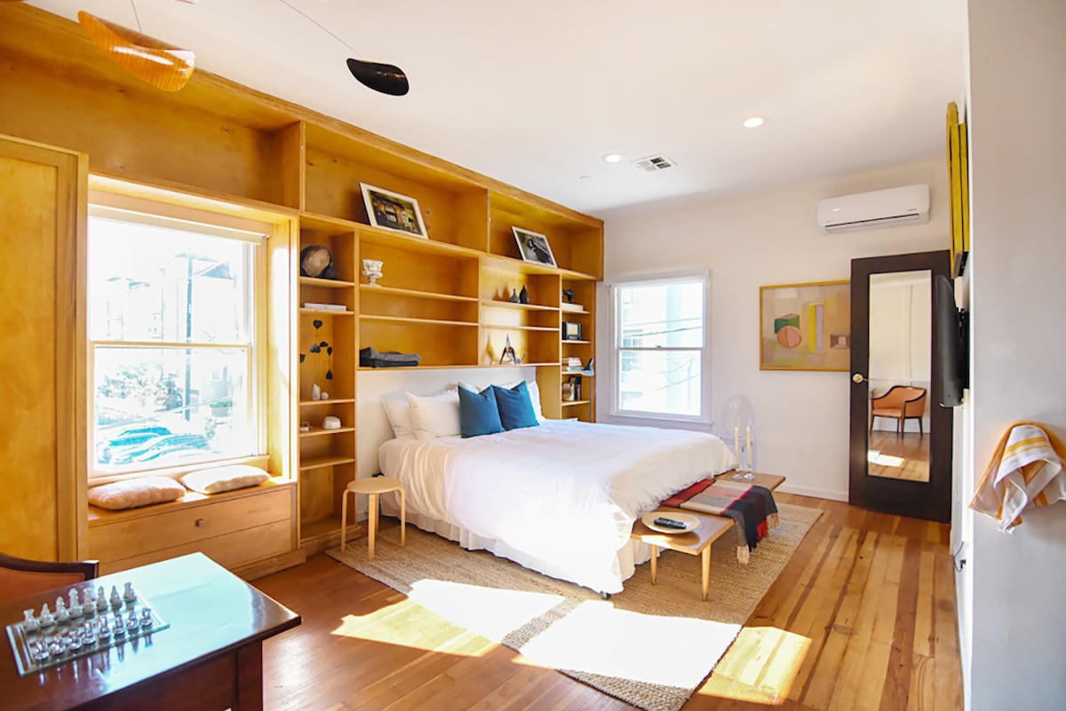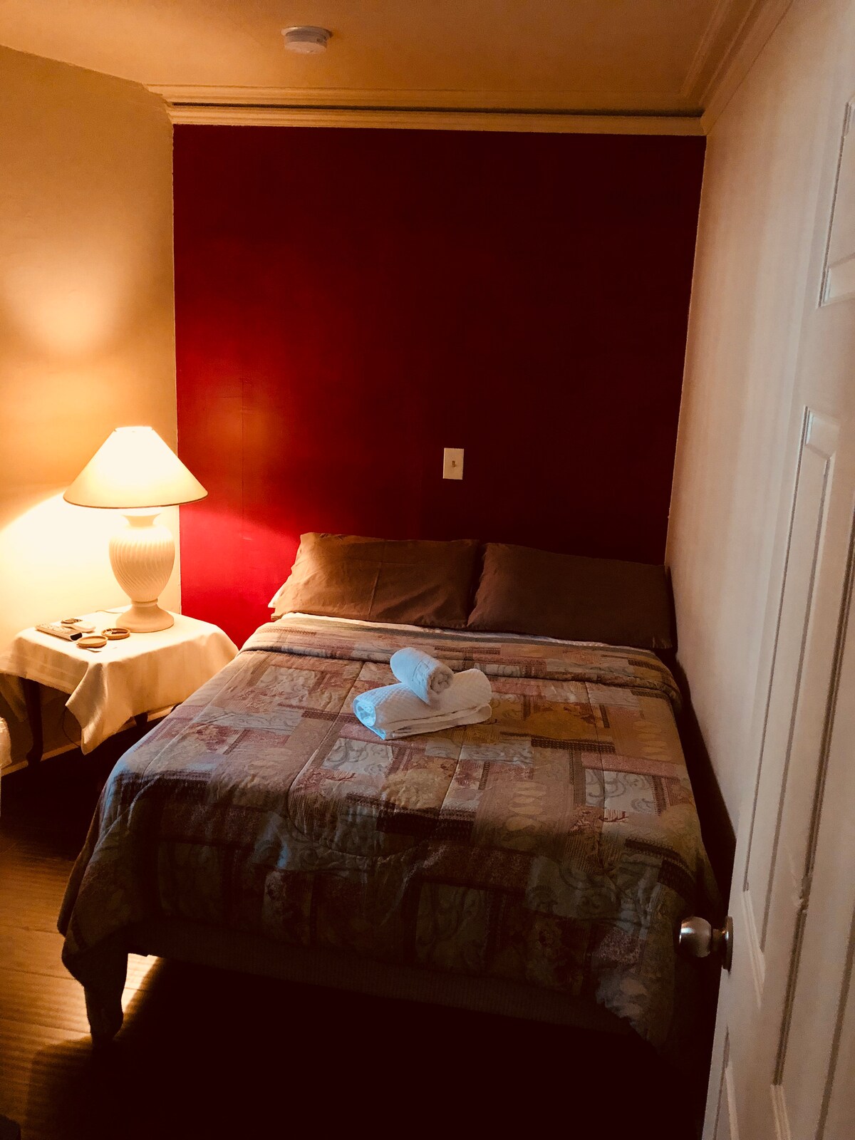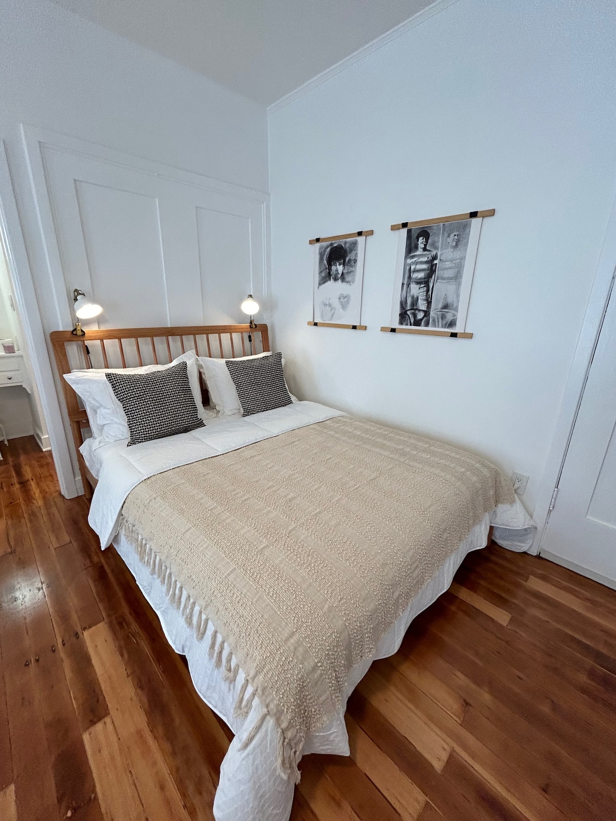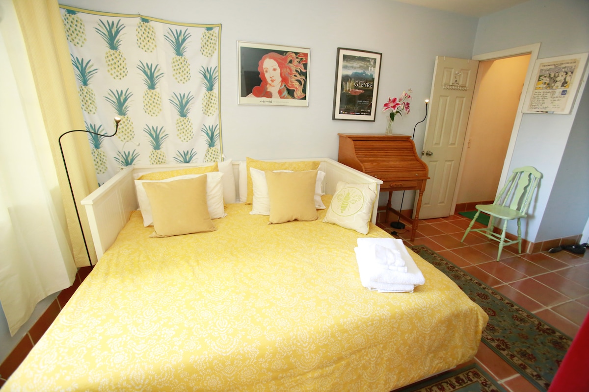 The guest room and bath can be accessed through a locked driveway gate to the backdoor of the house. The room features a king size bed, hardwood floors with area rug, a writing desk and closet. The renovated bathroom serves as double access to the lower level floor, as well as being attached to the guest bedroom. This bathroom is exclusive to the unit when occupied.