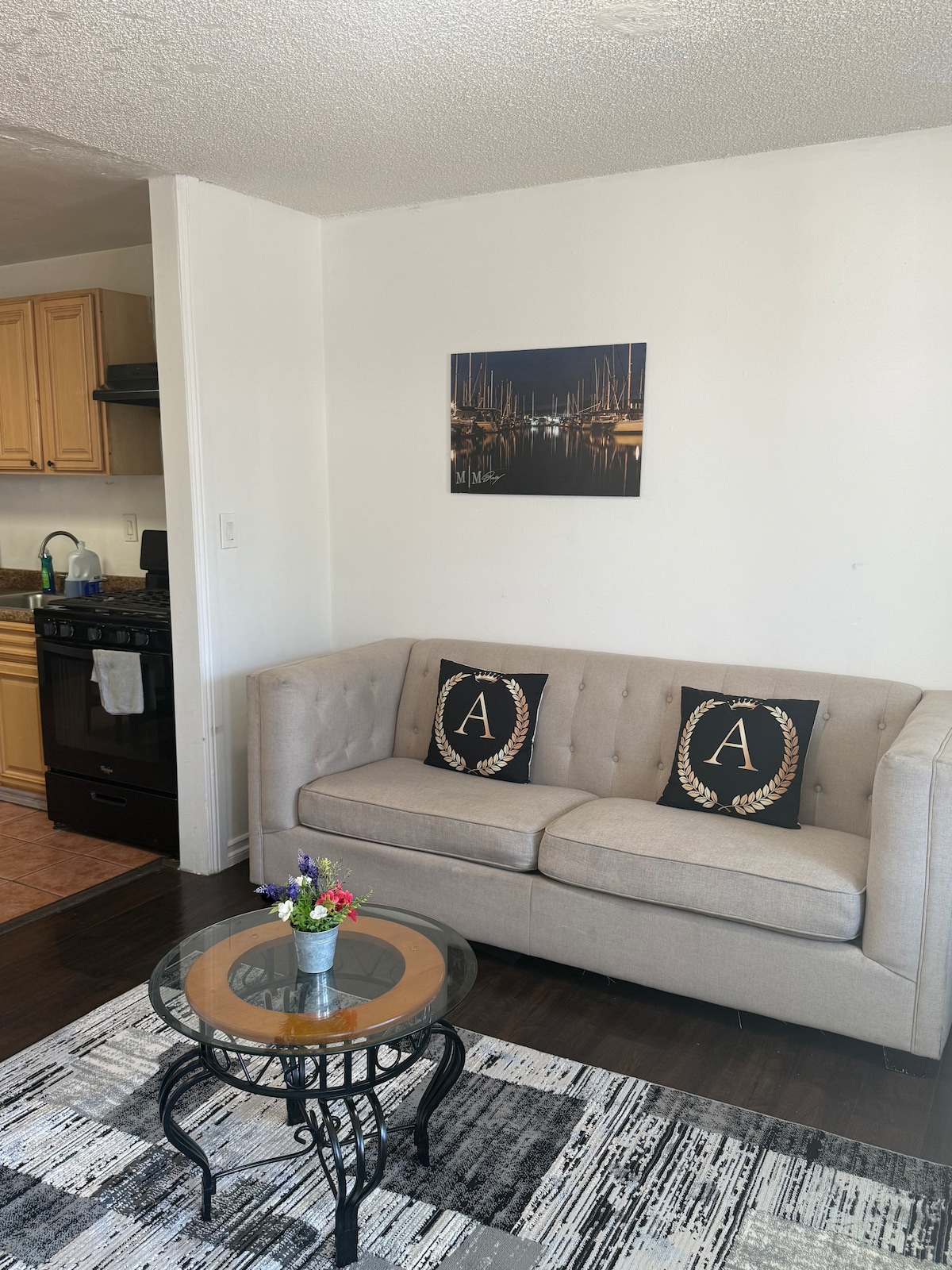 New, modern 1 bedroom apartment with space for 4, located within walking distance of downtown Larchmont Village, major studios and restaurants. This unit is on the 1st floor of a home with a separate entrance and completely locked off from the rest of the owners' house. Completely private, including your own back yard! The unit contains a kitchenette, fridge, 2-burner hot plate, convection microwave, sink, and coffee maker. There is a king in the main room and a full Murphy bed in a private separate space in the den area. There is no designated parking space, but there is usually ample street parking.