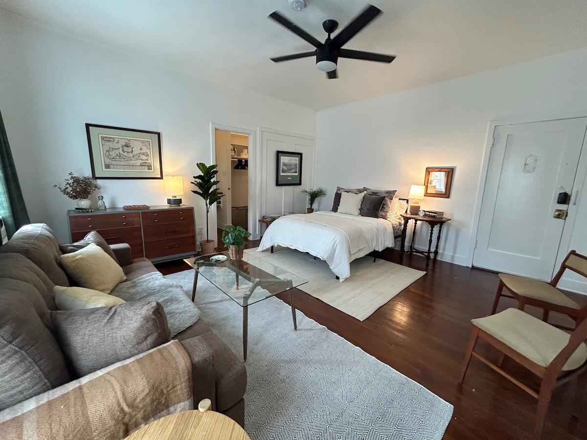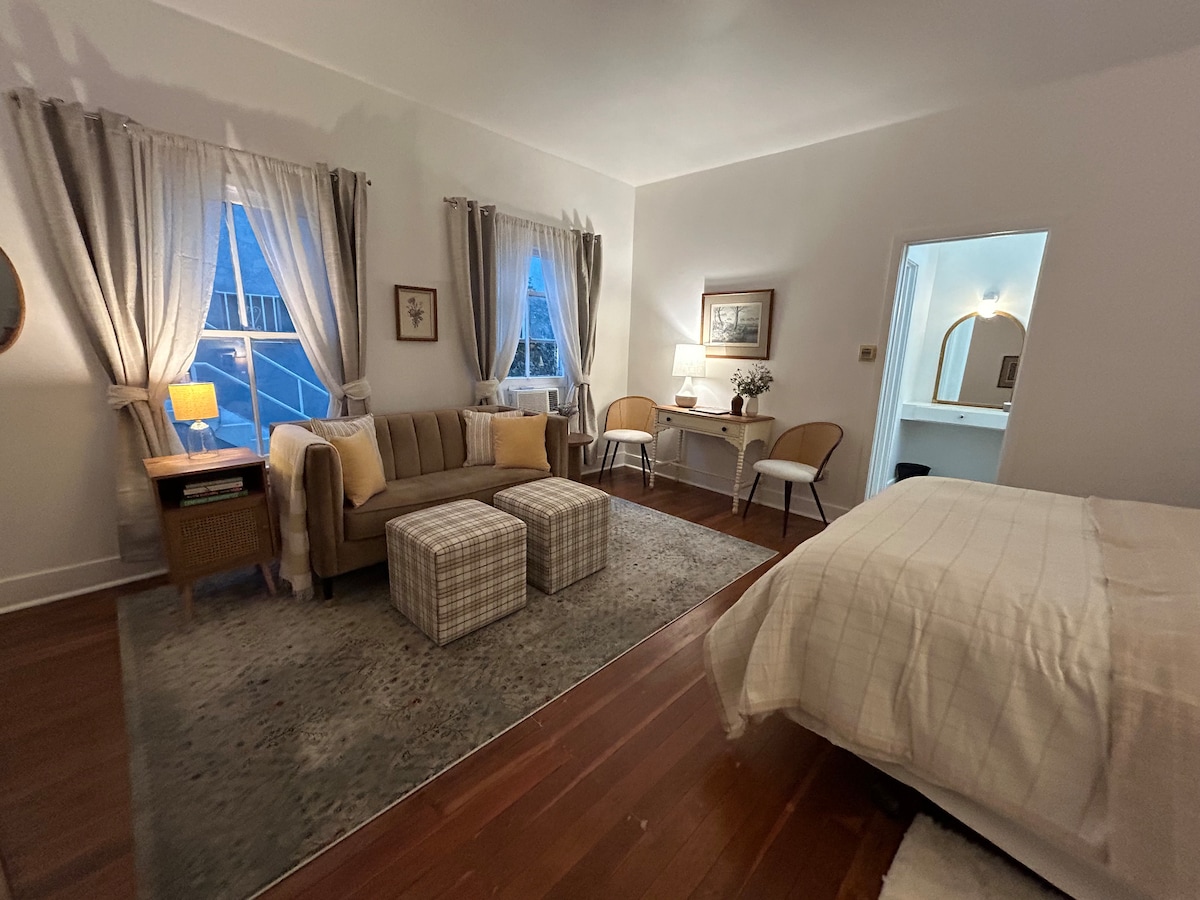 Unique, private “in-town” retreat with exclusive gated entrance to property & apartment with a small home feel. Enjoy meals overlooking lush greenery or unwind on a secluded rear balcony. Lovely 1936 Mediterranean character, beamed ceilings, modern amenities, no shared walls & beloved by long term guests for work or rest. *Inquire for longer stays than open nights.
