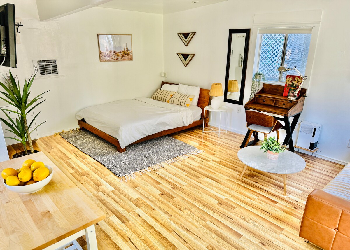 Bright, serene backhouse in central Hancock Park. Features a king bed, private full bath, free Wi-Fi, smart TV, fridge, microwave, toaster oven, coffee maker, couch, A/C, and heater. Enjoy shared access to a stunning backyard and pool (not heated). Safe, quiet, and walkable neighborhood close to cafes, shops, transit, and all the great sights Los Angeles has to offer.