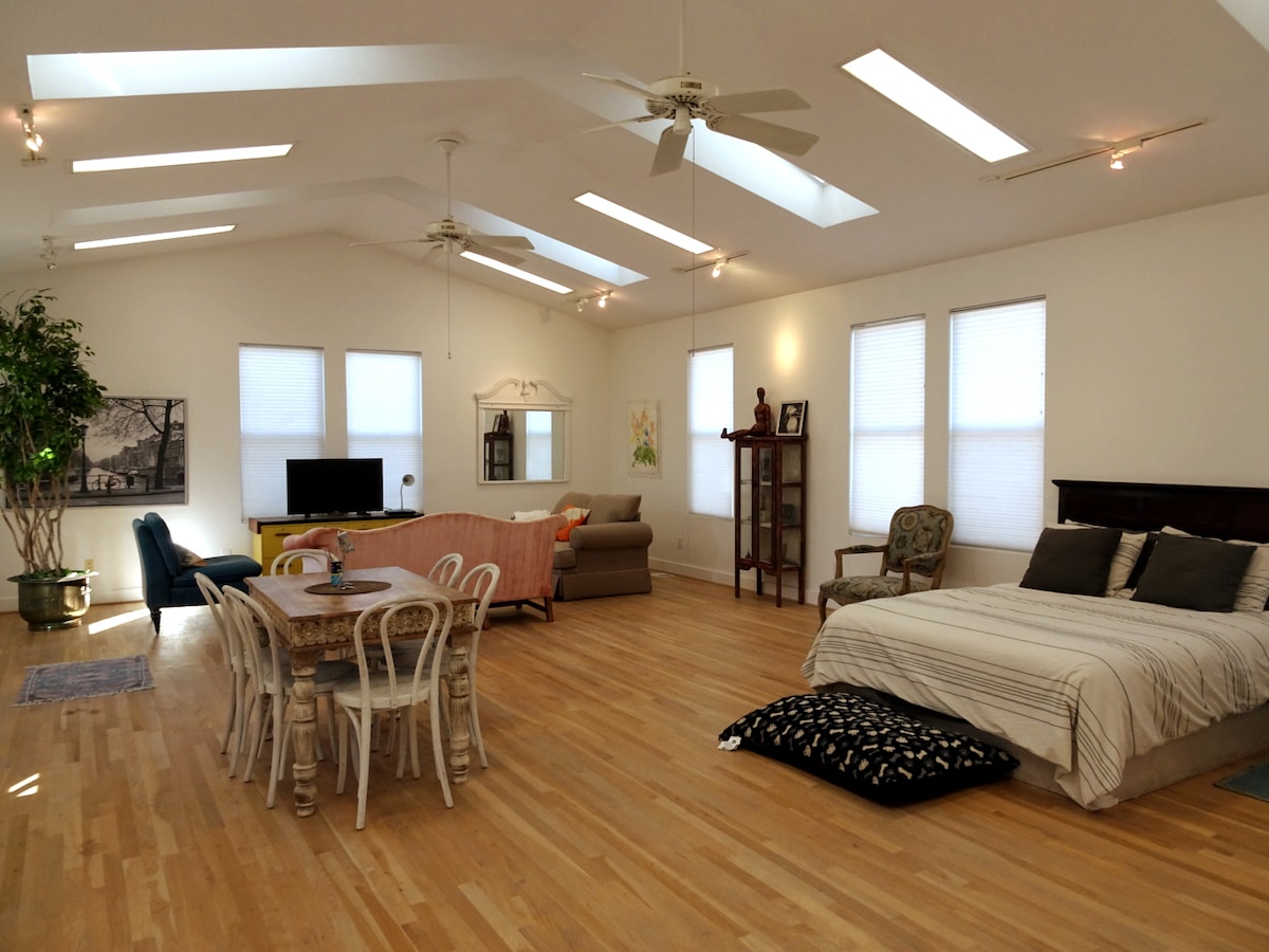 The space is unique and very special! It is very open and has plenty of light and views of mature trees. It is like being in a cabin or a large tree house :)