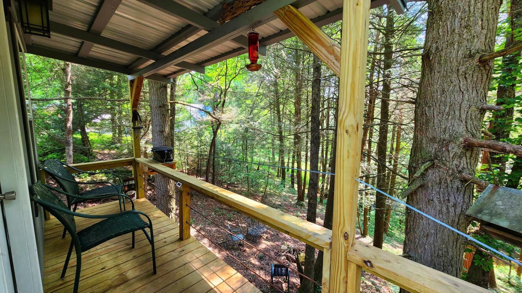 The cabin features a kitchen with a full-size propane stove, kitchen sink, microwave and full-size refrigerator. The kitchen is complete with everything you will need to cook meals during your stay. There is a small barrel-style table with four stools. The cozy living area has a futon, a chair and a Roku television so you can sign in to your streaming channel. A private bathroom with a shower, toilet and a small sink vanity, complete the downstairs. Upstairs is an open loft bedroom with a queen size bed. Make sure you check out the stairs that lead to the loft. If you have mobility problems - this will not be ideal for you. The front porch offers a swing and two Adirondak chairs for your relaxation. This is the perfect place to begin and end your day.