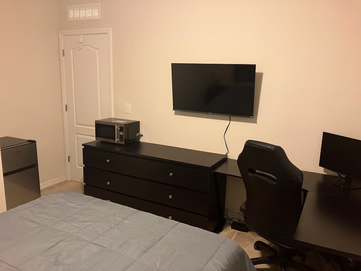 There are dark cherry wood bamboo hardwood floors in the bedroom and hallway and light tiles on the floor of the bathroom. There is a king-sized bed and night stand. An hardwood and chrome ceiling fan. A standing shelf lamp with candles and decorations on the shelves. A 40-inch flat screen Roku smart TV with all of your favorite apps. A desk and chair, a full length mirror behind the door. A microwave and mini refrigerator, an iron and ironing board, 2 tray tables, a fire proof safe. A drip coffee maker, coffee mug and filters, hair dryer, digital scale, 2 kitchen towels, body towel, wash cloth and hand towel.