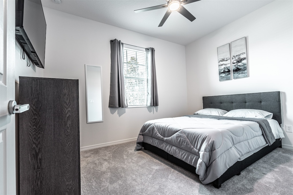 * Master bedroom has a king-size bed and it includes a TV. This bedroom also has a ceiling fan.