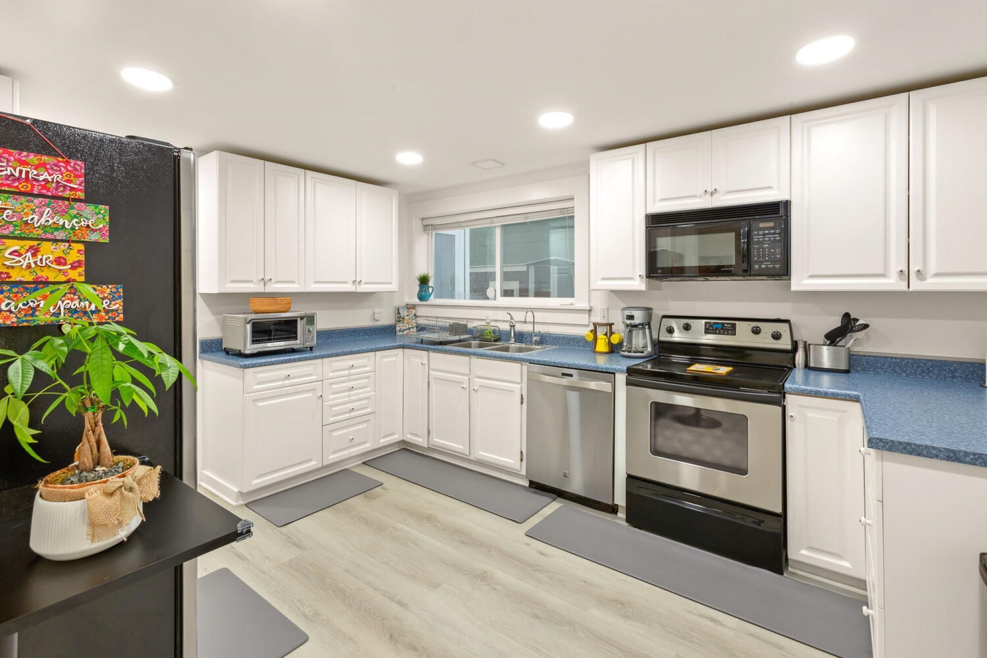Full kitchen with all essentials (cookware, dishes, coffee maker)