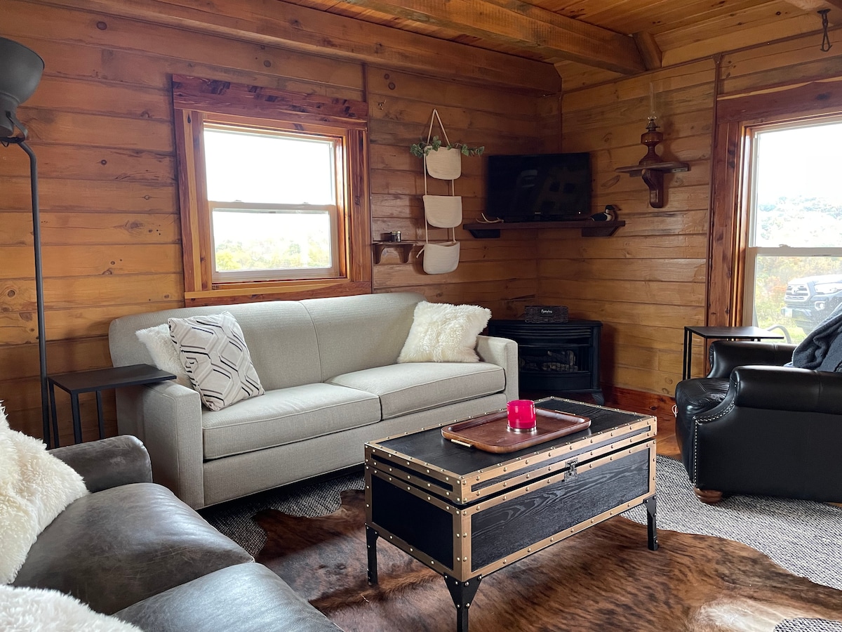 Escape to our cozy Treehouse retreat and fully immerse yourself into the beautiful scenery of Hocking Hills! This tiny home is studio-style, offering a queen bed and a foldout sofa for extra lounging space. Enjoy the comforts of full HVAC, fast Wi-Fi, and an electric fireplace for those chilly evenings. We also have a Bluetooth sound system with speakers built into the ceiling and a DVD player with a small collection of DVDs for your entertainment.
