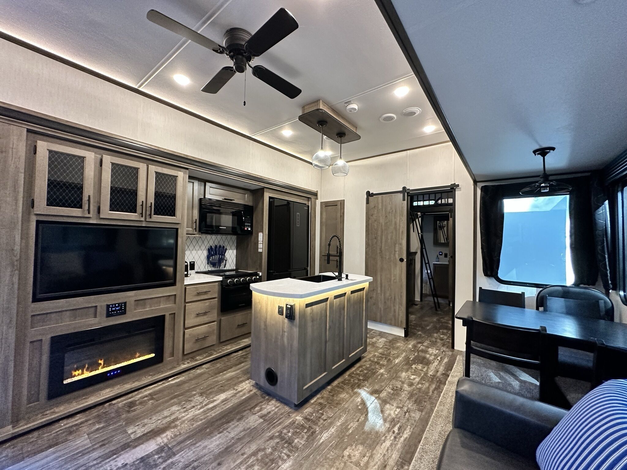 Indoor Living: 2 smart tv’s, dining table, ceiling fans in each room.