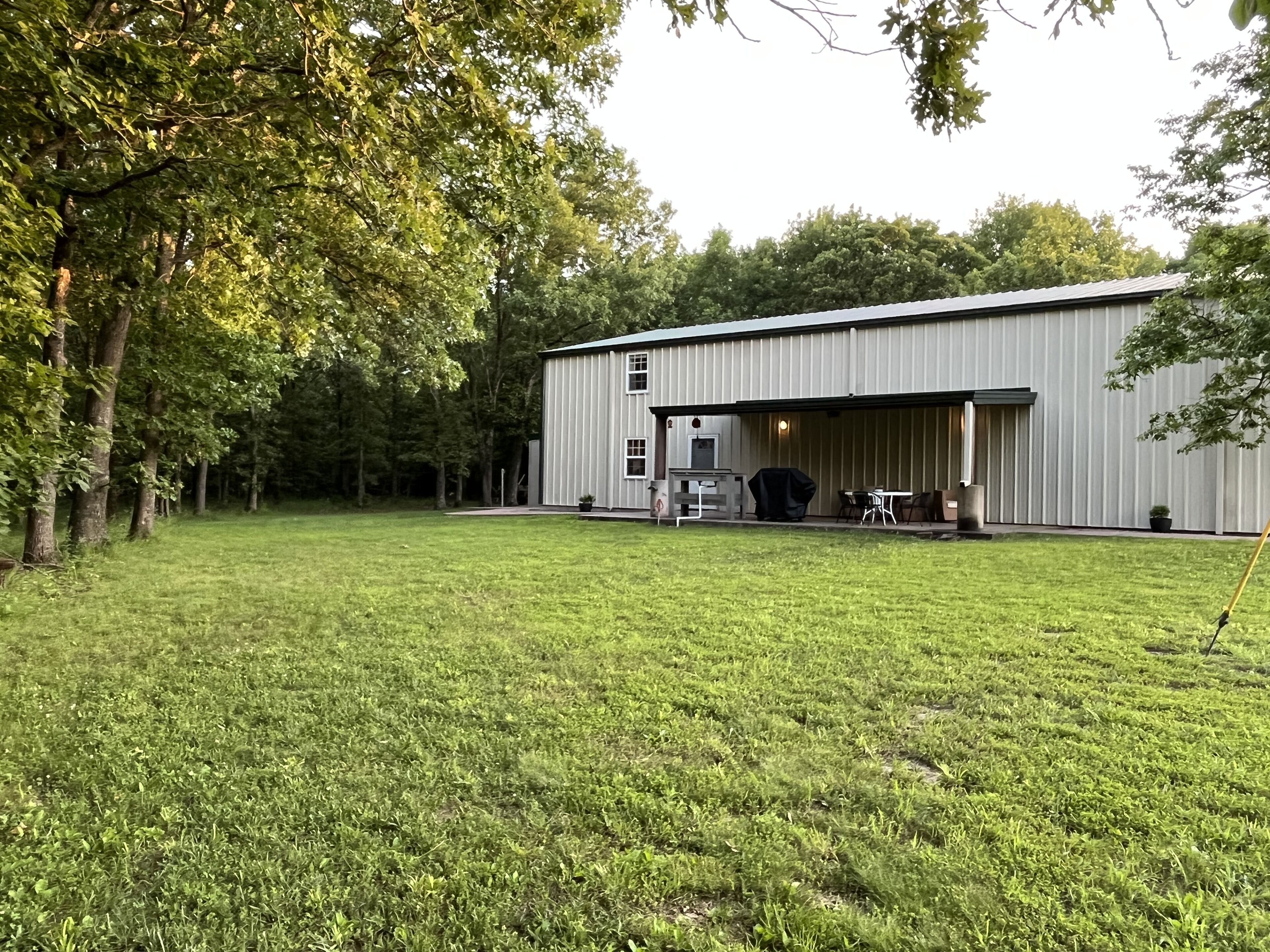 Enjoy this barndominium after a long day of hunting, fishing or boating. Wake up and sip your coffee on the covered patio while watching the wildlife stroll by or watch the sunset while enjoying the fire pit. Hike the 14 acres, enjoy the fish you caught by using the cleaning station and grill. Whether you need a couple's getaway or have a family gathering, we can accommodate you as this home sleeps up to 8. On the main floor there is plenty of room for everyone at the large farmhouse table or in the sunroom. Cook up a delicious meal in the rustic kitchen while visiting with family or friends with the open concept space. You can also find one bedroom and the full bath with a walk-in tiled shower and double vanities on the main floor. Upstairs there are 2 bedrooms and a large family room with a sectional that includes reclining seats while you enjoy your favorite movie or tv show. There is a shower in the garage and an outhouse with a working toilet that is convenient for hunters. There is lake access in the neighborhood 1 mile away via old corp of engineers road/boat ramp (road is a little rough). From The Great Escape you are only 7.5 miles to Long Shoal Marina, 9.5 miles to Bucksaw Marina, 12 miles to Truman State Park Marina, and 15 miles to Warsaw.