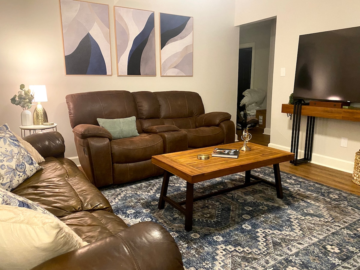 Great sized Living room has Leather sofa bed that pulls out to a queen bed.