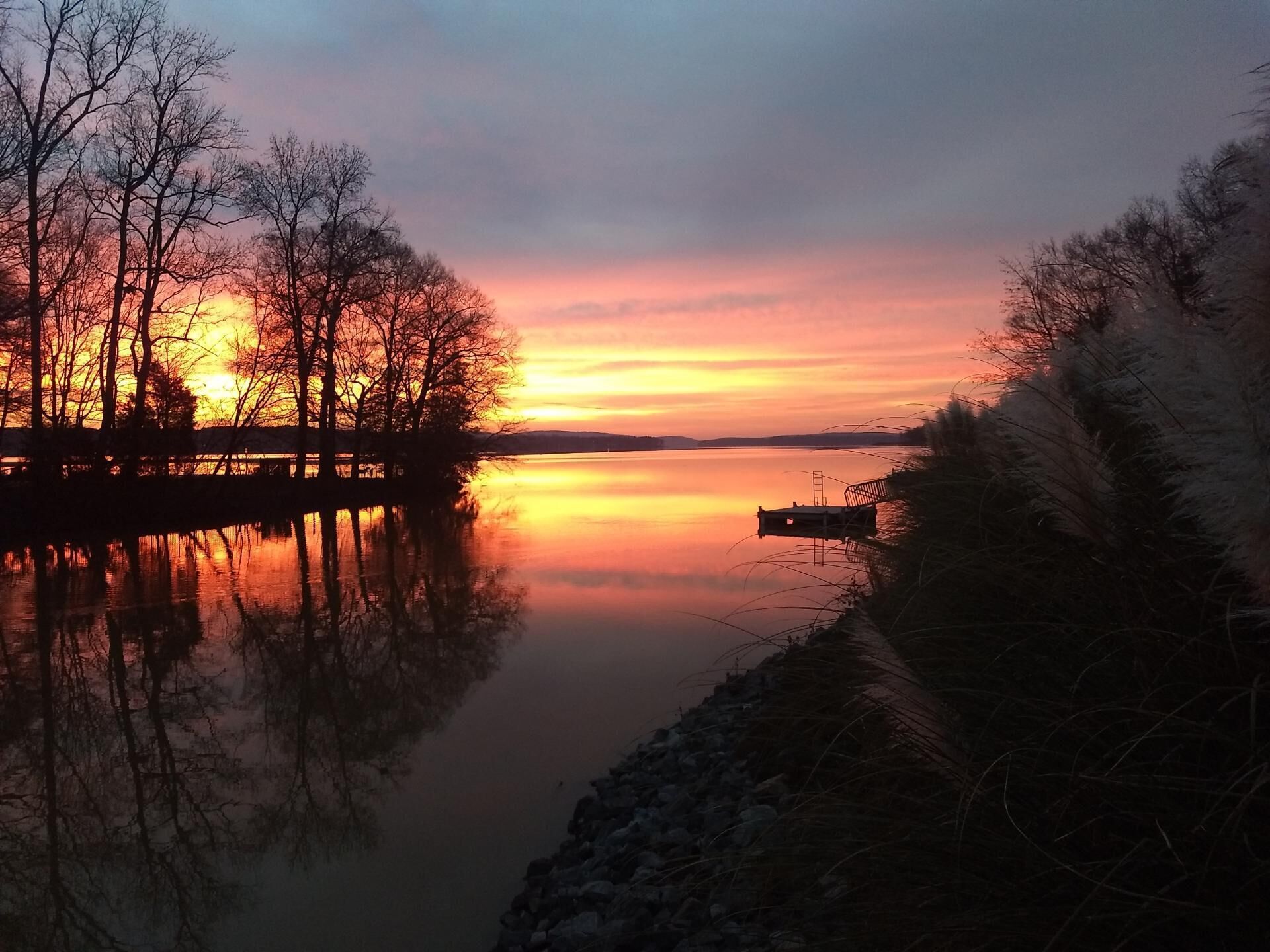 Beautiful rustic, yet sophisticated house built in 2008. It is on a large wooded lot on the main channel of the lake with a really big water view. The best sunset view is from the upper screened-in porch, with the trees silhouetted in between. Blue herons, cranes, and many other birds and wildlife. Hike to the dam on a trail through the woods; enjoy sitting on the dock or swimming and boating off the dock in the summer.