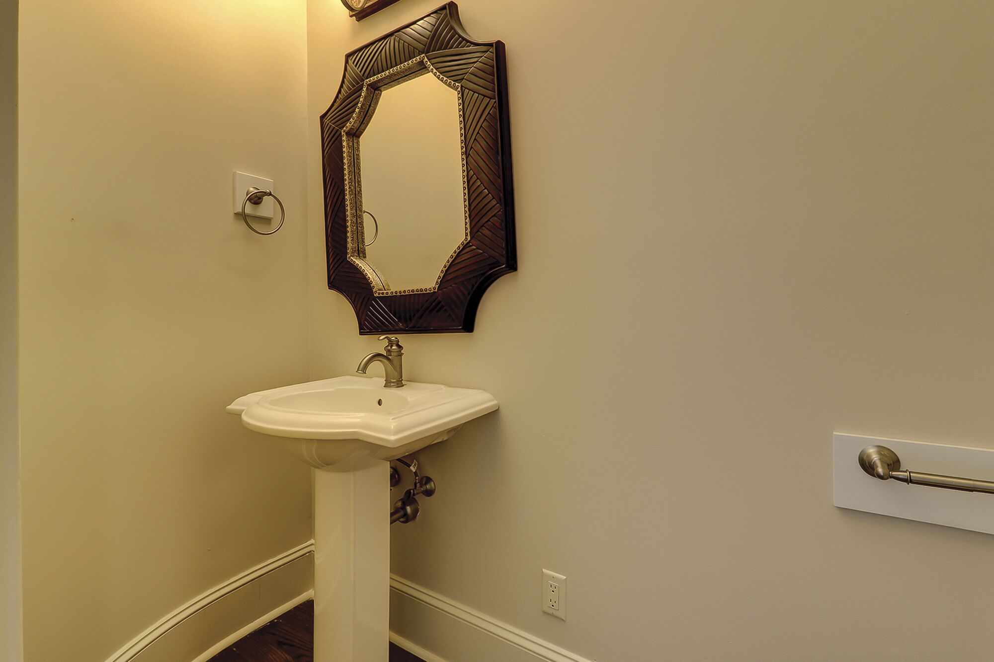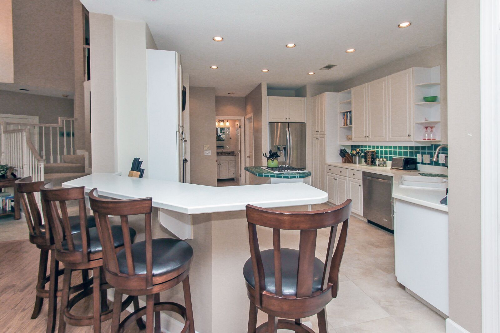 Once inside the villa has an open living space for the dining room and living room. The living room overlooks the back patio and lagoon and has a large flat-screen TV. The dining area has seating for 6 and is just outside the galley kitchen. Just off the kitchen is the laundry area. There is also a powder room on the 1st floor.