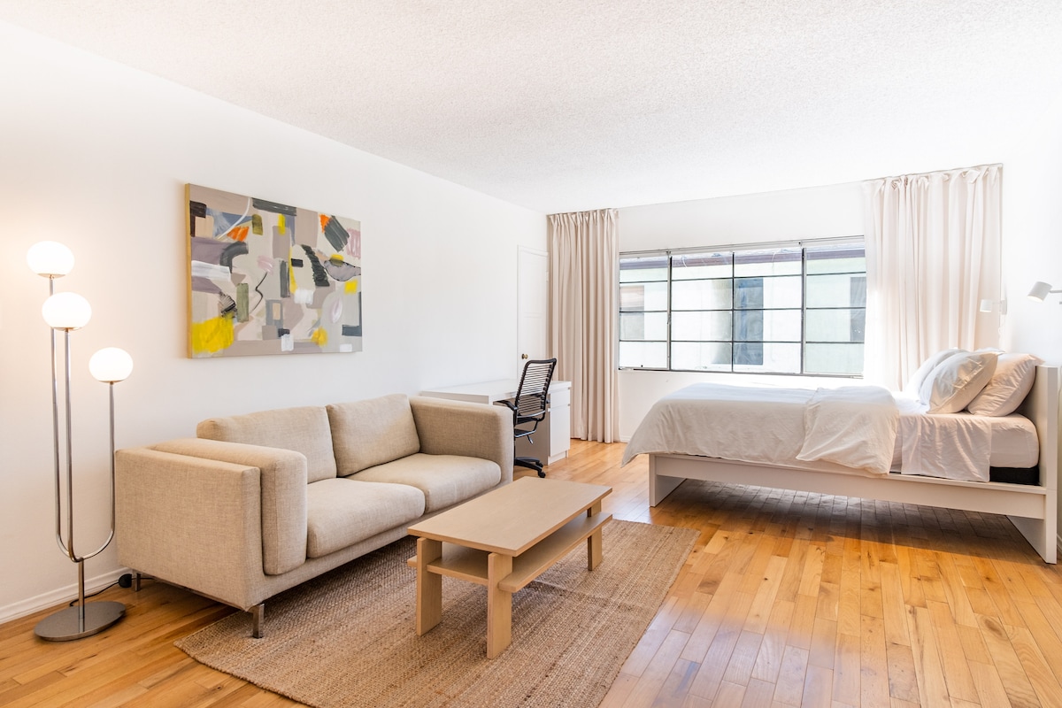 Bright and spacious studio located just off the HWY 101, you can get anywhere around central LA within a 15-minute drive. You can explore some of L.A.’s most iconic attractions, including Dodger Stadium, Hollywood’s Walk of Fame and Grand Central Market.