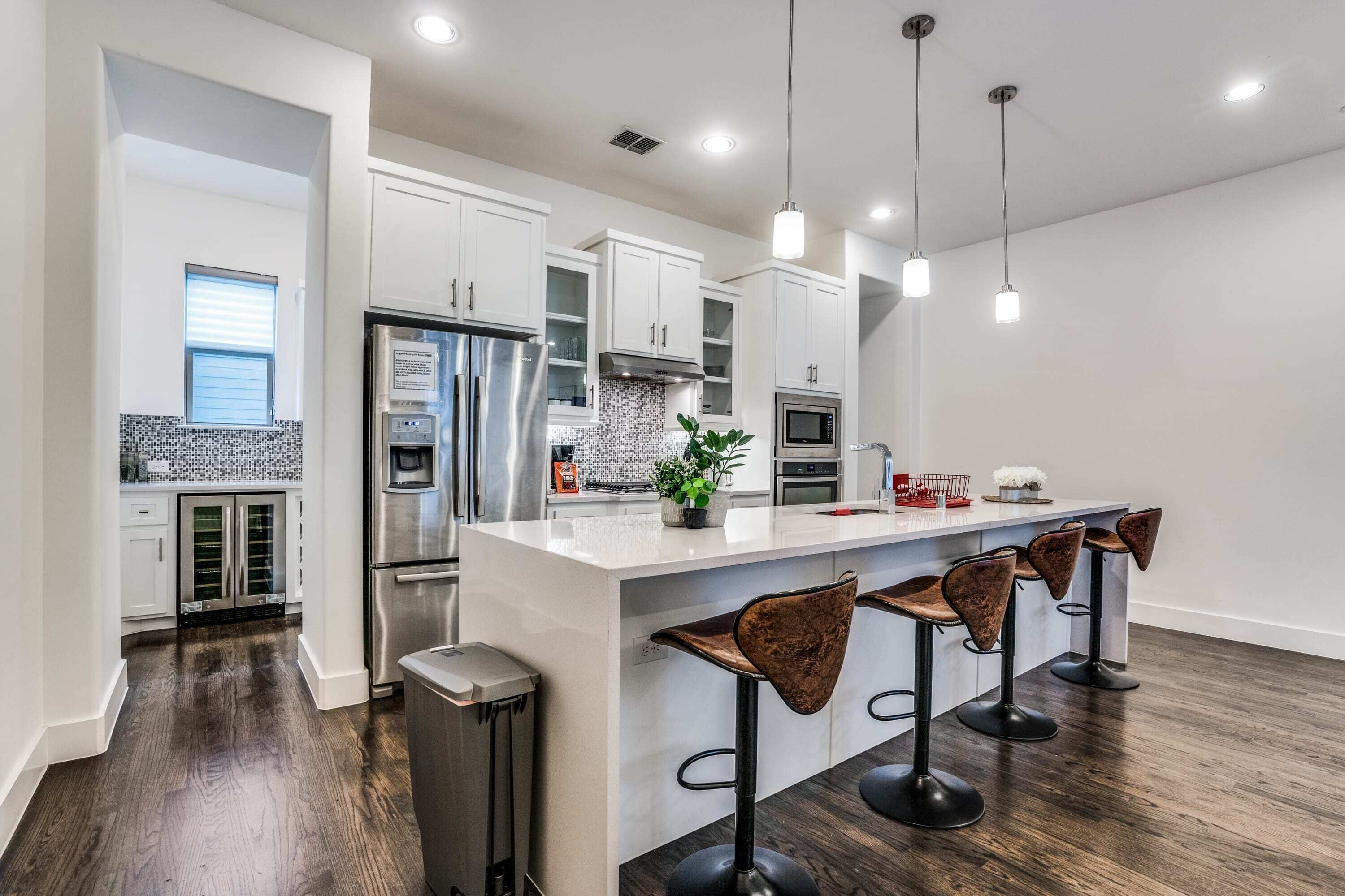 - "Our 3-night stay at this beautiful & spacious townhome was fantastic! Check in was easy & the host was very prompt w all communication. Townhome is spacious - all furniture is extra comfortable, windows provide great lighting during the day & ample lighting in all rooms at night – extremely clean, décor is tasteful & pleasing - pictures on web site are accurate. Kitchen equipped w all appliances, dishes, glasses & utensils - even a variety of snacks, coffee & tea. We didn’t need the washer/dryer, but they’re conveniently located on bedroom level. Two full baths are very roomy - large showers w rain shower & handheld shower head - host provided blow dryer, hand soap, shampoo, conditioner, body wash & plenty of towels. There are 3 half baths – one each on garage level, kitchen level & rooftop level. Both bedrooms are large with walk in closets & beds are super comfy. Great bonus to have a garage to park our car! We didn’t get to use the rooftop as the weather didn’t cooperate, but it’s a large space w lots of seating & a fire feature. Location is great – walkable to shops, restaurants & Trader Joe’s. On our second day we noticed that the ice machine & water in the fridge had stopped working – it wasn’t a big deal at all, but we notified the host & he brought us a case of bottled water & a bag of ice even after we told him it wasn’t necessary. Truly, a gracious host & a fabulous place to stay! The next time we travel to Big-D we hope this wonderful townhome will be available!"