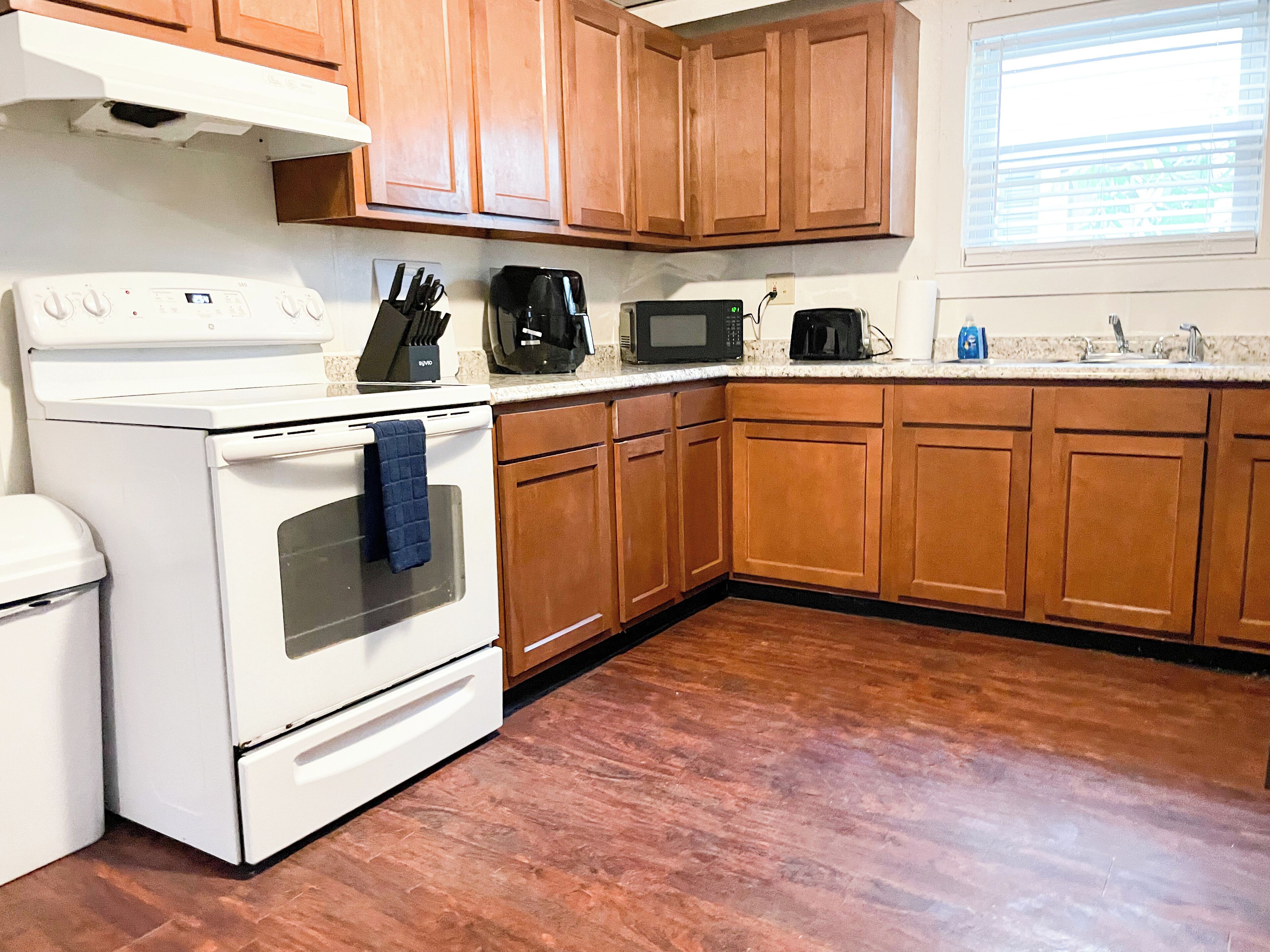 KITCHEN: Stove/oven, refrigerator, microwave, dishware/flatware, cooking basics, coffee maker, toaster