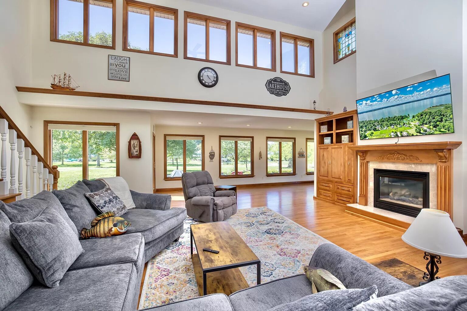 Bring the whole family to this great place with lots of room for fun. 1 King bed, 2 Queen beds, 4 twin beds & a super comfy couch. Full access to the boat dock included! Natural gas grill in the back, extra extra large yard and the view! Bring the entire family!
