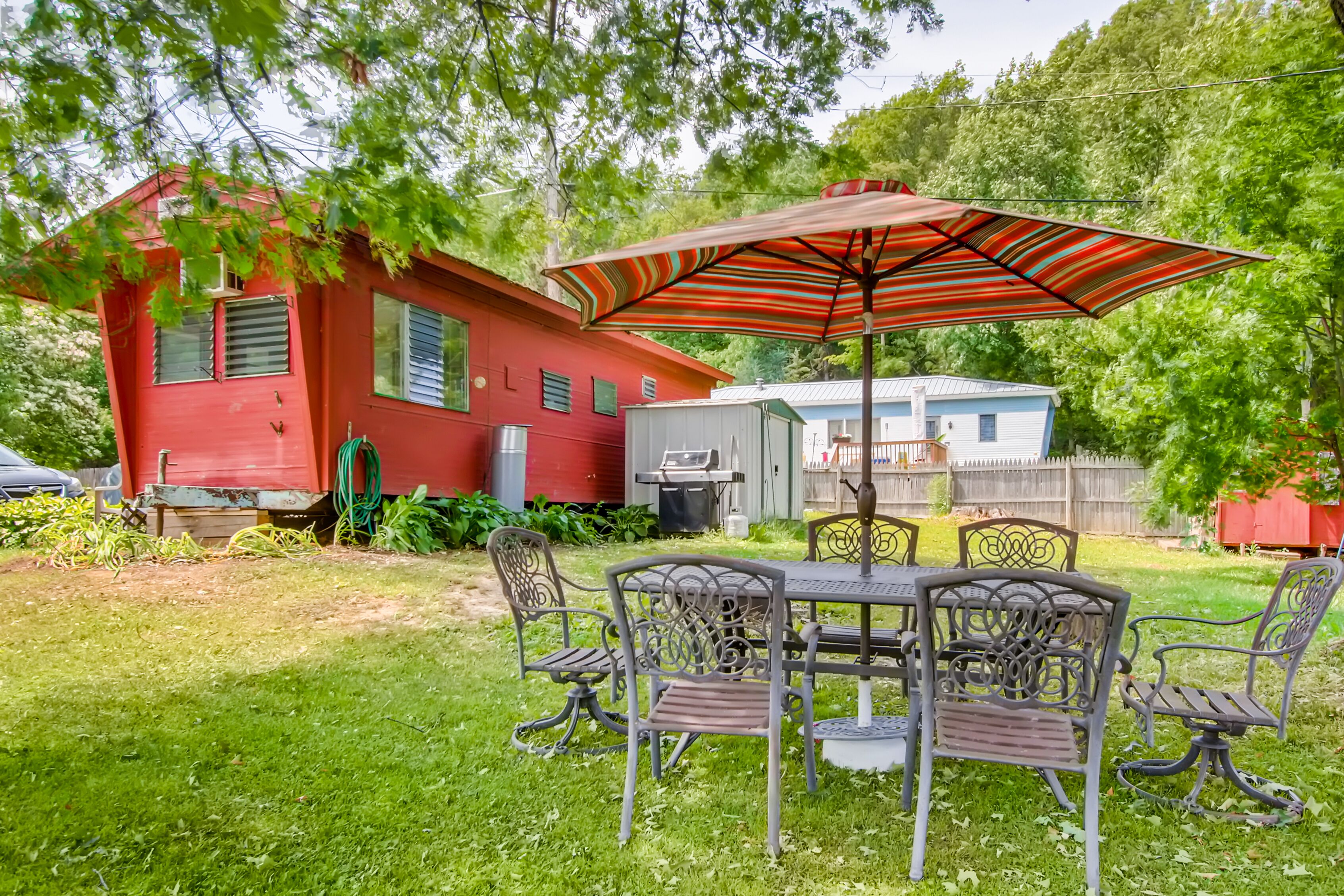 Outdoor space includes a long, narrow, private driveway, wooded areas to explore, private dock, picnic table, patio with Solo Stove fire pit, sloped lawn, hammock, and a clothesline. A gas grill is also provided. There are steps from the parking area to the main entrance.