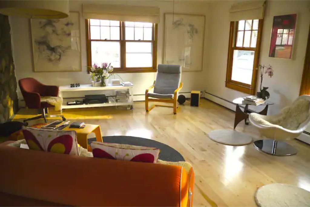 Three floors, four bedrooms—on the 1st floor we have a full kitchen, living room with Sonos speakers, a dining room, and a working wood stove. The bedrooms on the 2nd floor are one king, one queen, and two full-size beds, The final bedroom is on the 3rd floor and sports a queen bed. We have 3 separate living rooms on each floor to hang out in, including a Sunroom. Guests will find the home stocked with all the necessary amenities including towels, linens, kitchen basics, and toiletries.