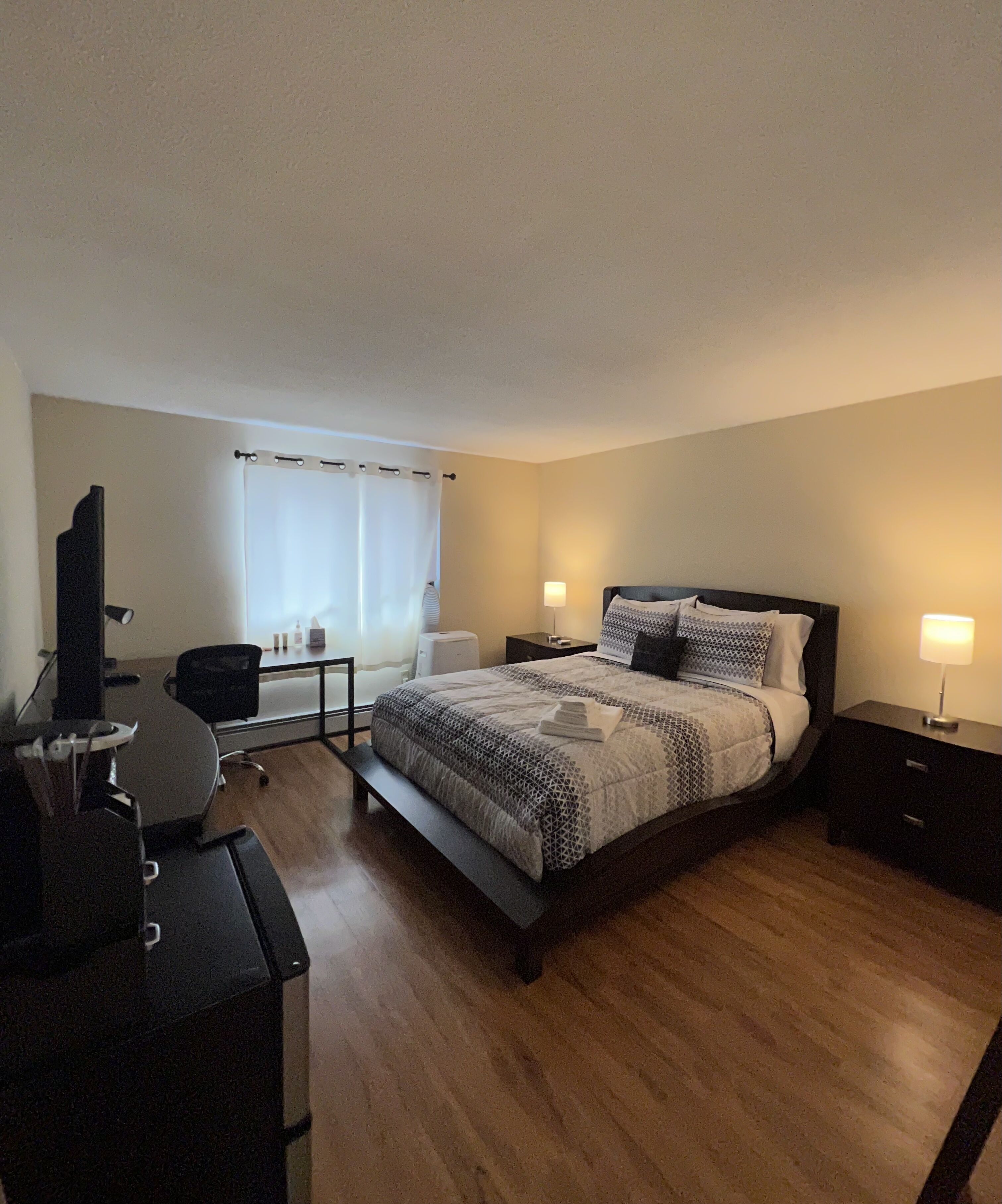 The guest bedroom doesn’t have a separate entrance, you’ll have access to your bedroom through the main entrance of the apartment. The bedroom has a mini fridge and coffee maker. We don't have kids and pets, it's a very peaceful place to stay. Our apartment is in a beautiful condo, in a quiet and cozy city. The bathroom is shared with us. If you want to use the microwave in the kitchen, feel free. We have a gym in the condo, which you can also access. There is a security camera facing the front door.