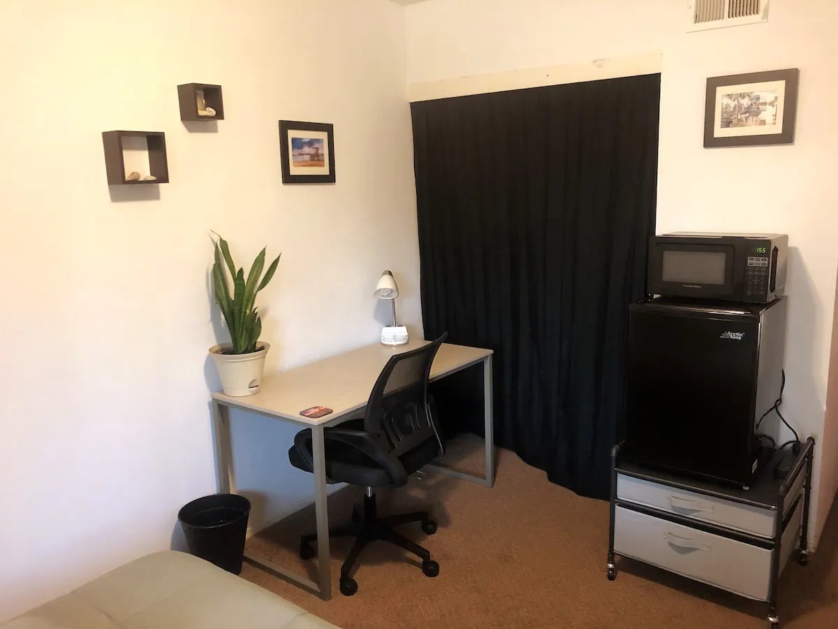 The room is self contained, with Fridge and Microwave in-room. Shared bathroom but NO access to the rest of the house and yard. Work at the desk and enjoy High Speed Wifi. Cable is available on the in-room, wall mounted pivot flat screen TV. Convenience store, Pizza Joint, Mexican food and Laundry Mat across the street. Walking distance to Main Street Downtown, Pier, City Beach, Pacific City Mall and Dining. Use the Circuit App to get a ride to and from the Beach for $2 per ride.