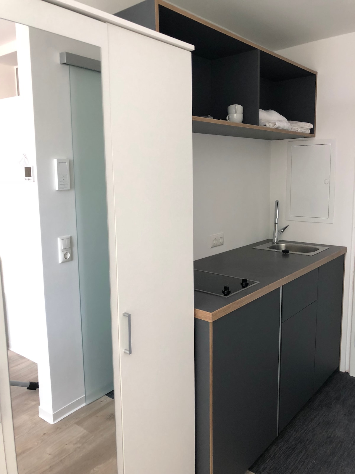 In the flat you will find a practically furnished small kitchen, equipped with an induction hob, fridge, microwave, kettle, toaster and a coffee filter machine. A satellite TV, which can be used free of charge, provides entertainment. A cosy hallway, inviting living room and a clean bathroom complete the picture of an urban home away from home.